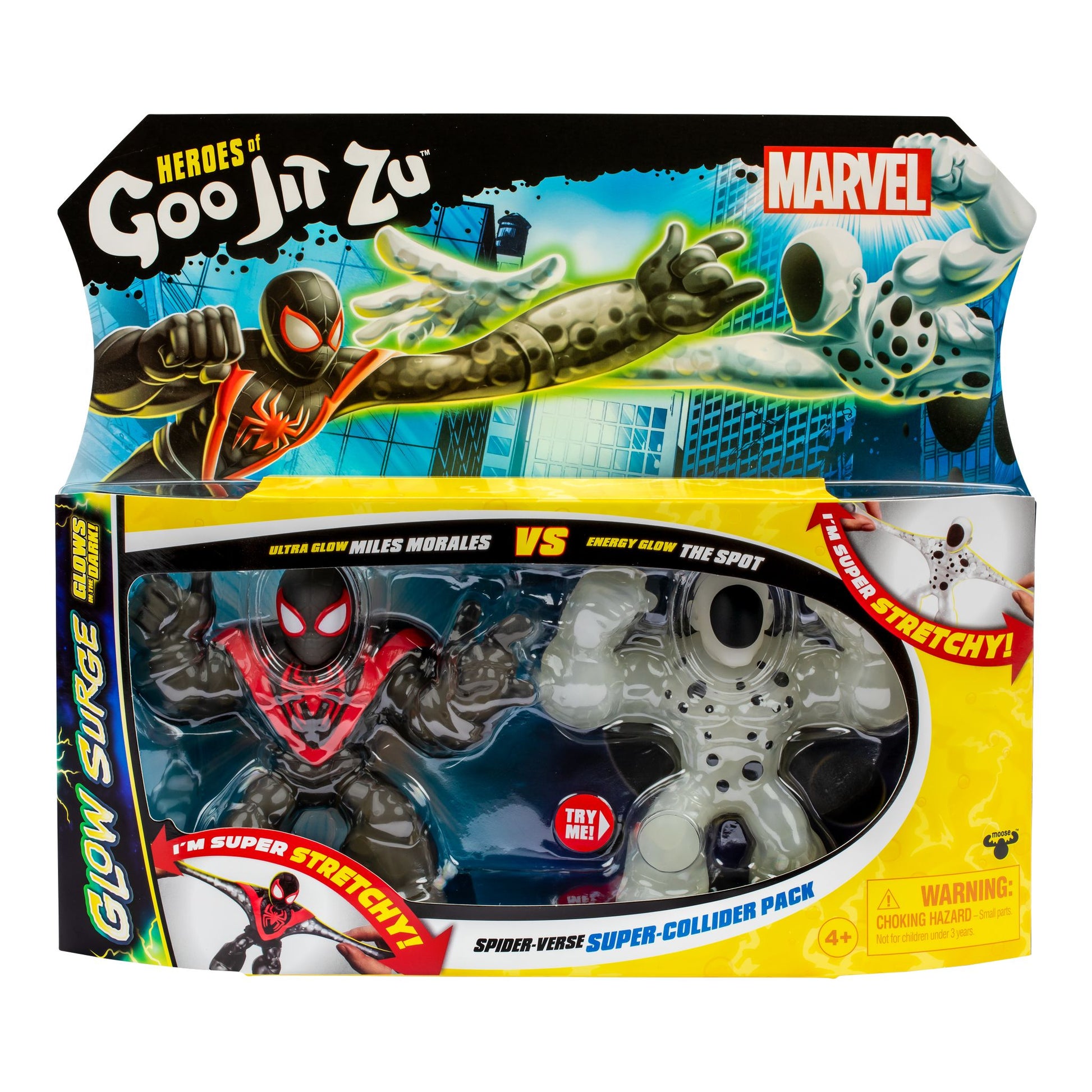 Battle straight out of the box! The Spider-Verse Super Collider Pack contains one super stretchy exclusive 4.5" Miles Morales Goo Jit Zu figure with Ultra Glow filling and one 4.5" super stretchy The Spot action figure with awesome Energy Glow filling.