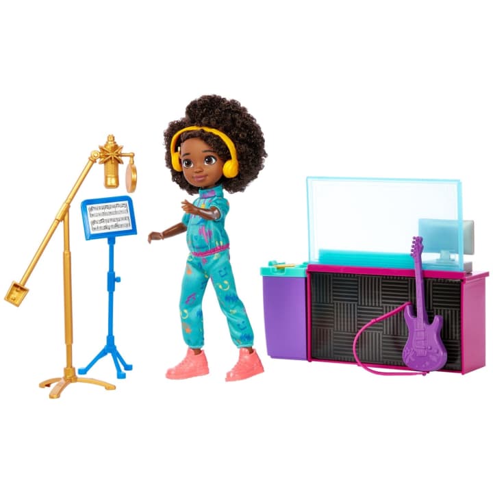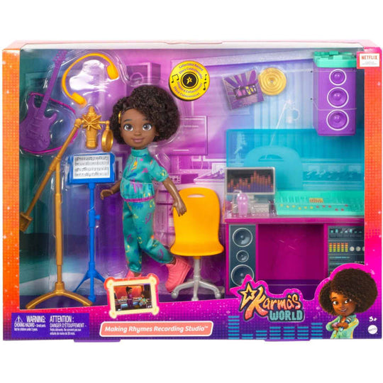 Make magic with Karma doll at this Making Rhymes Recording Studio playset! This 13-piece set is filled with good times, just like Lady K's studio in Netflix's Karma's World™. Karma doll is dressed in her fresh tracksuit and ready to rhyme. She can be both the performer and producer with this 2-sided playset that has a recording booth side and mixing side. With accessories like a guitar, microphone, headphones, and more -- Karma doll has everything she needs to make her next hit song. There's also a collectible record that unlocks a music clip in the Transforming Musical Star Stage playset (sold separately). Colors and decorations may vary.