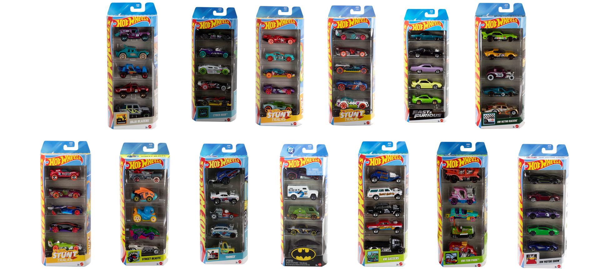 Hit the gas on any Hot Wheels collection with a 5-pack of assorted vehicles in 1:64 scale. Each die-cast toy car or truck features authentic details and eye-catching decos that kids and collectors love. These packs all have a specific theme to appeal to collectors and car enthusiasts alike. Vehicles are perfect for play or display kids and collectors will want them all.