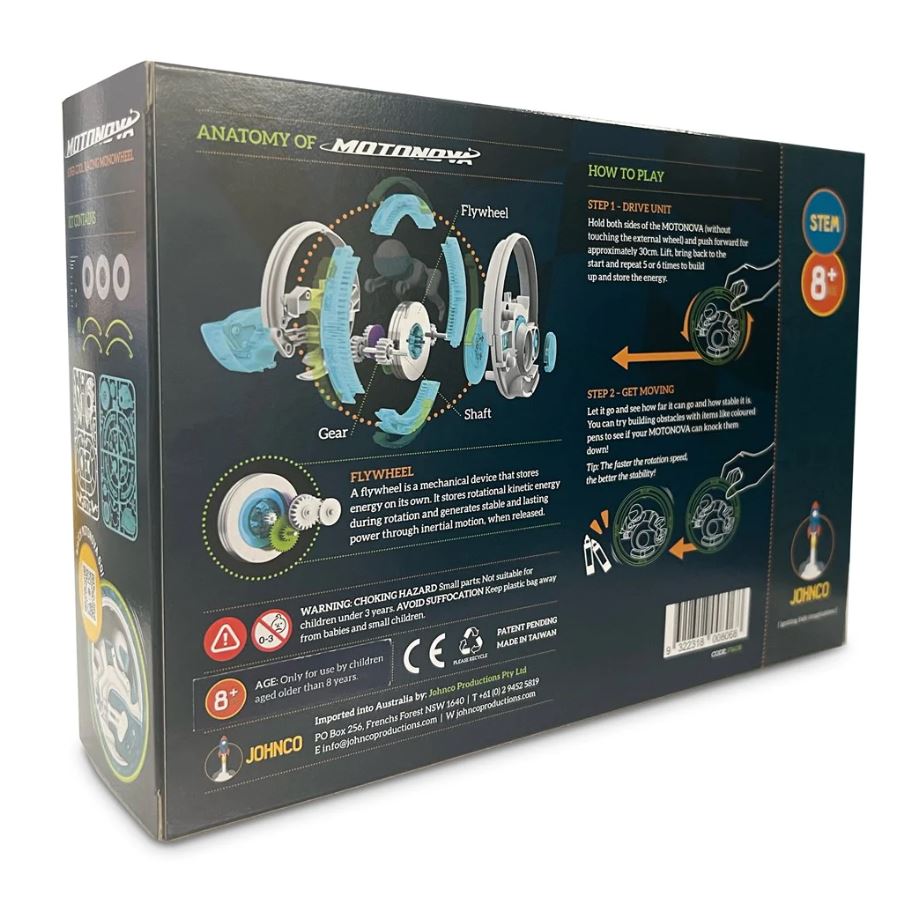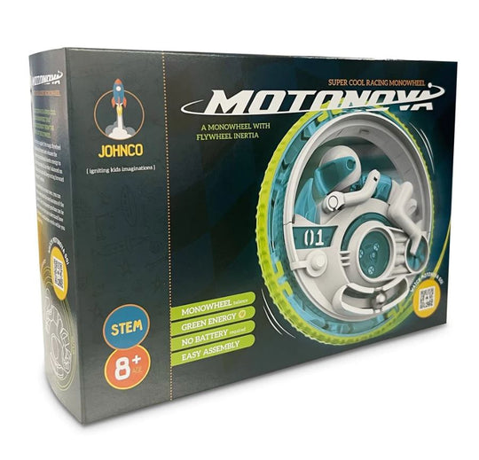The MOTONOVA is a super cool racing monowheel that generates energy from the inertia of the flywheel. After force is applied, the magic flywheel stands up on its own and releases the power using rotational kinetic energy to drive the gearbox. It can stay balanced on a flat surface and will keep racing forward for up to 15 metres. By assembling it on your own, you can better understand the mechanisms of the gearbox.