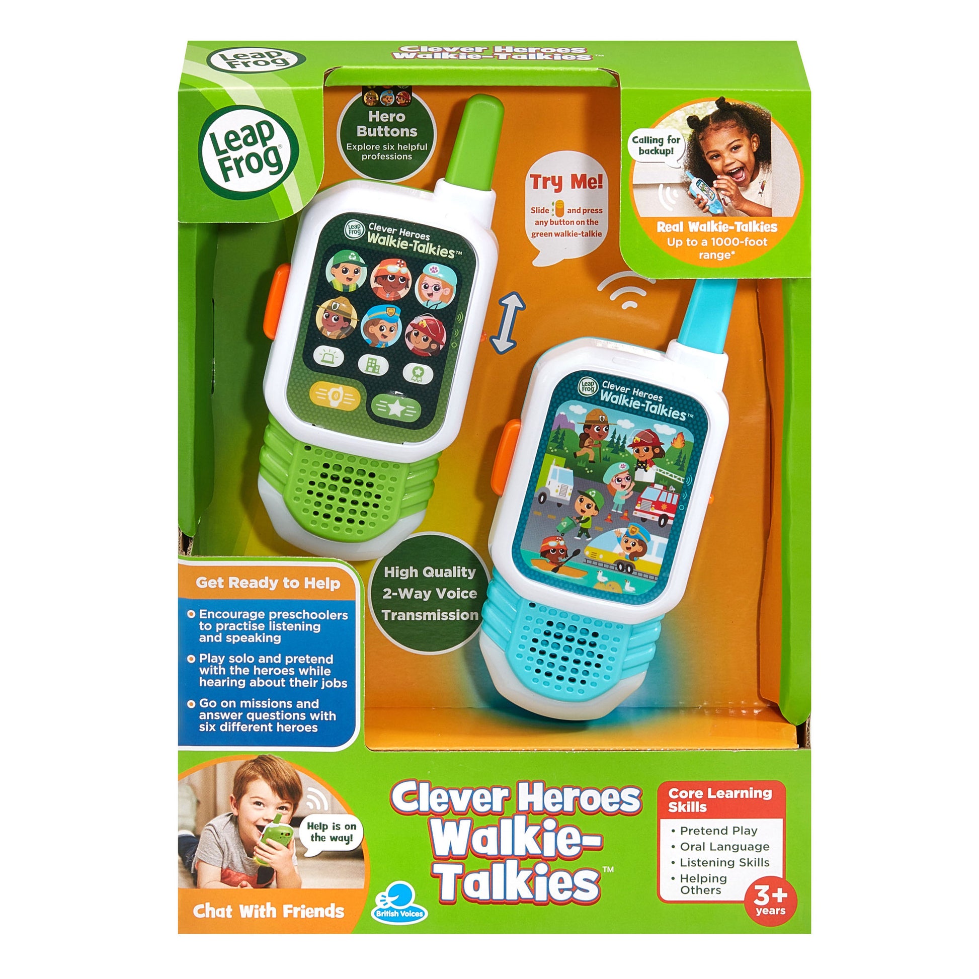 Meet everyday heroes with the Clever Heroes Walkie Talkies. Listen and respond to 6 different hero characters as you complete interactive missions and learn how you can be a hero at home.