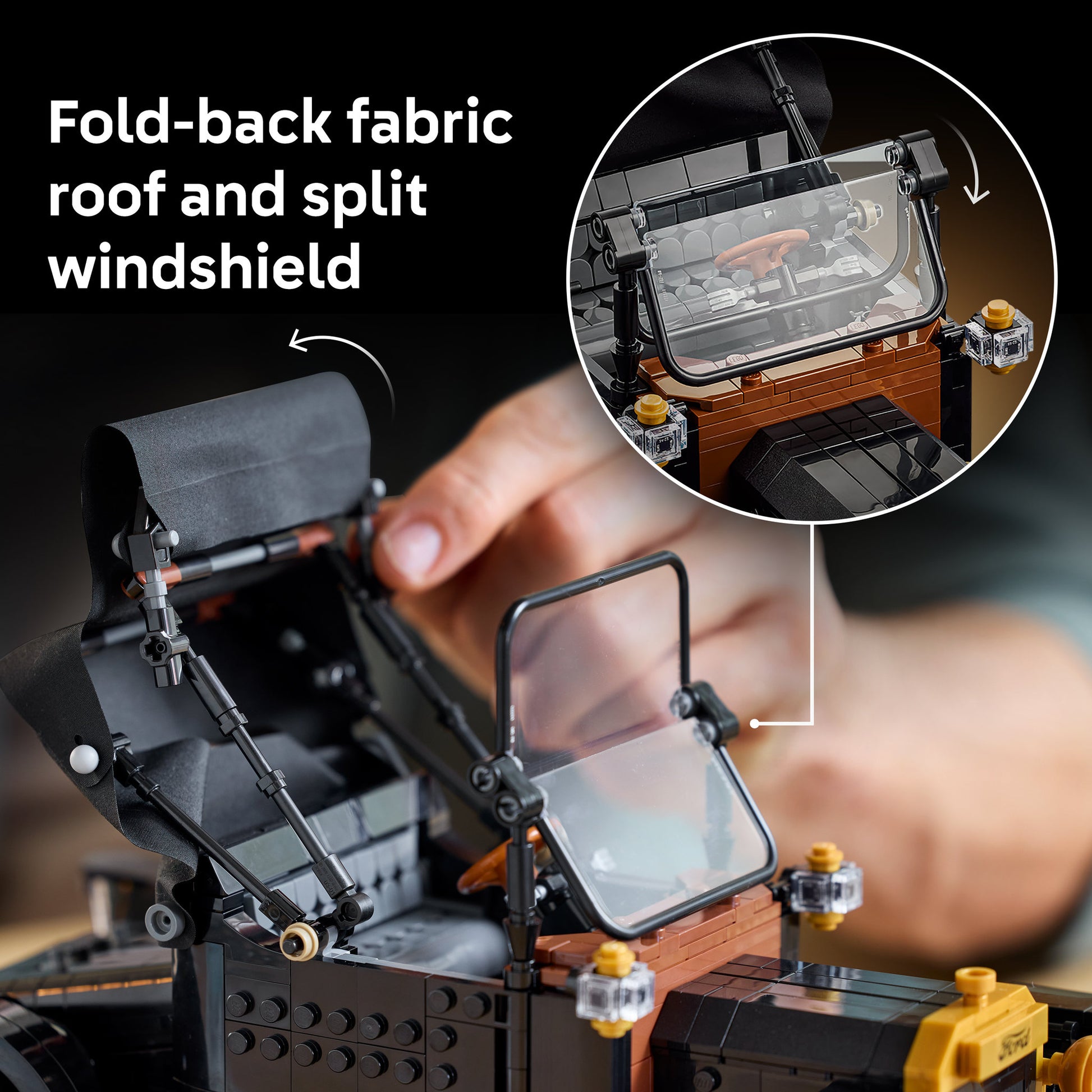 Take a nostalgic journey with this LEGO® Icons model car kit for adults. Capture the elegance of the 1910s Ford Model T with gleaming black bodywork, golden accents and tall spoked alloy wheels with slim white tyres. This detailed replica is packed with authentic features, including a foldback fabric roof and fold-down split windscreen. Enjoy a rewarding build and display your creation for all to enjoy.