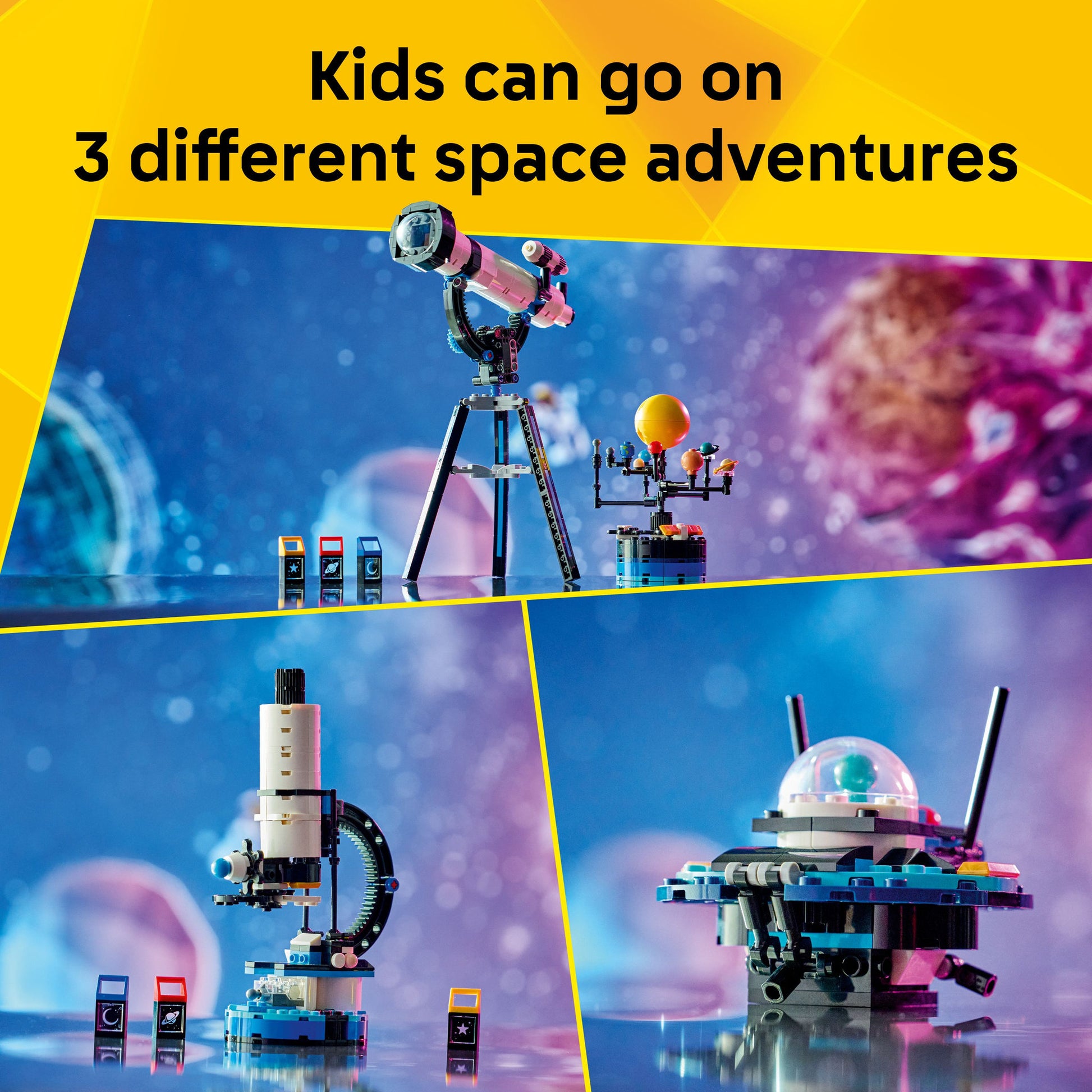 ENDLESS PRETEND-PLAY OPTIONS – Kids can play out stories with 3 STEM building toys (models cannot be built simultaneously): a telescope toy with a solar system model, a microscope toy or a UFO model