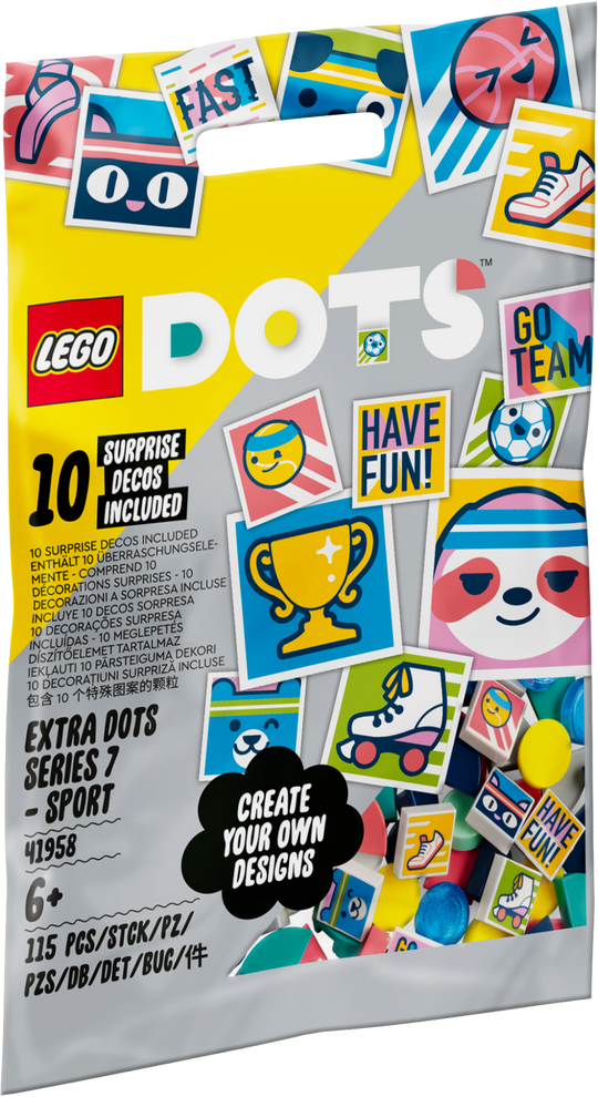 - Design, redesign, do it again – Inspire an arts-and-crafts fan with this LEGO® DOTS Extra DOTS Series 7 – SPORT (41958) decoration kit. The creative fun starts when they open the bag