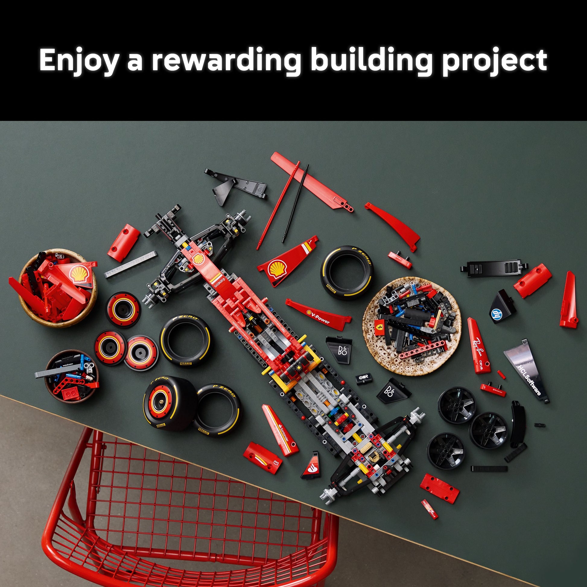Feel the thrill of the racetrack as you assemble this 1:8 scale LEGO® Technic Ferrari SF-24 F1 Car for adults. Explore realistic features like the steering, 2-speed gearbox, and printed tyres. Recreate activating your DRS by adjusting the spoiler. Then remove the engine cover to view the V6 engine. This immersive project lets F1 fans celebrate their passion with a display piece to cherish.