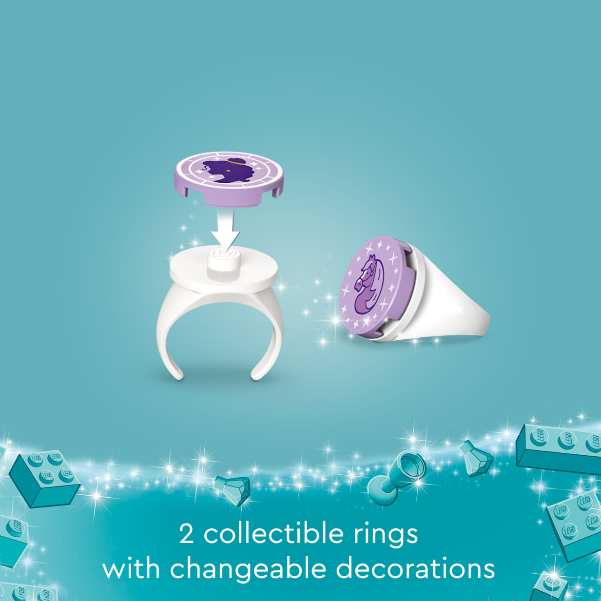 Take a ride with Belle and Philippe. Build this charming LEGO® ǀ Disney Princess set to help Belle take books to her friends in the marketplace. Hitch Philippe to the carriage then load the books in the back of the carriage. Seat Belle in front and head off. Share your love of Belle and Philippe with 2 collectible rings, each with a different decoration that can be changed out whenever you like!