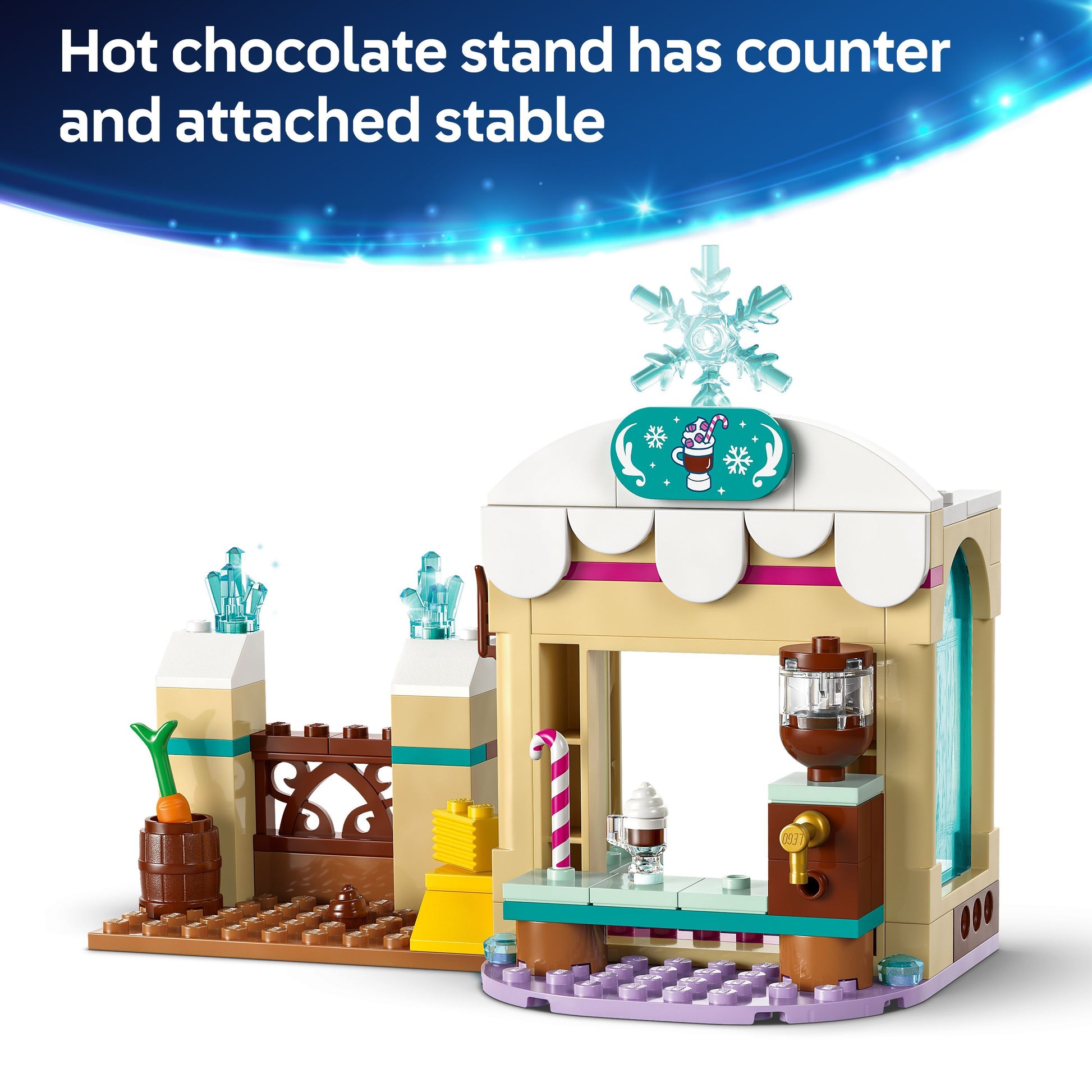 Measurements – The 192-piece building set includes a hot chocolate stand and attached stable that, together, measure over 12 cm (5 in.) high, 8 cm (3 in.) wide and 8 cm (3 in.) deep