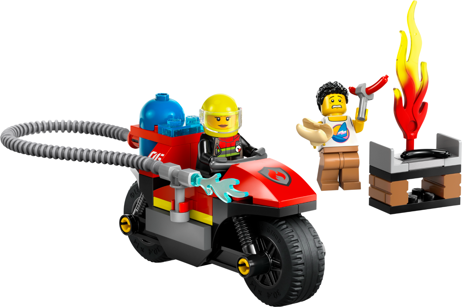 Yikes! A citizen’s cozy barbecue has turned into a roaring fire! Deploy the fire rescue motorcycle and race to the scene. This machine is ultrafast and ultracool with super-wide tires, an onboard water tank and a hose. Help the firefighter put out the flames to save the sausage… and the day! Fun adventures await in LEGO® City.