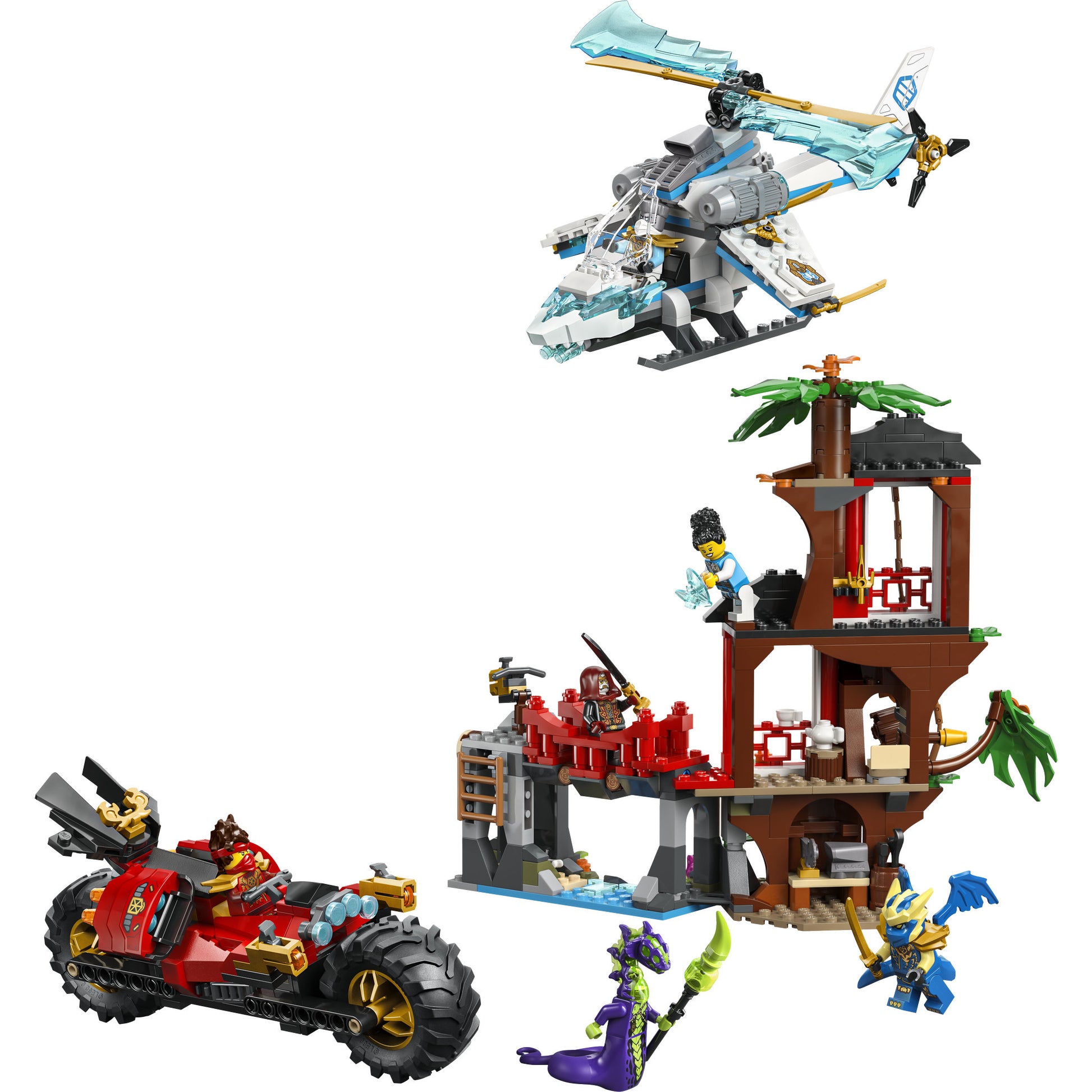 Team up with Kai, Zane, dragon form Jay and Euphrasia to defend their tree house hideout. Be on alert for an attack in the Whispering Woods from the Acid Monster and the Loyalist. Swing into action on a vine rope or stop them with a secret trap that releases a rock and a bridge that spins around. Afterwards, jump into Zane’s helicopter or Kai’s ninja motorcycle to deliver the knockout blow!