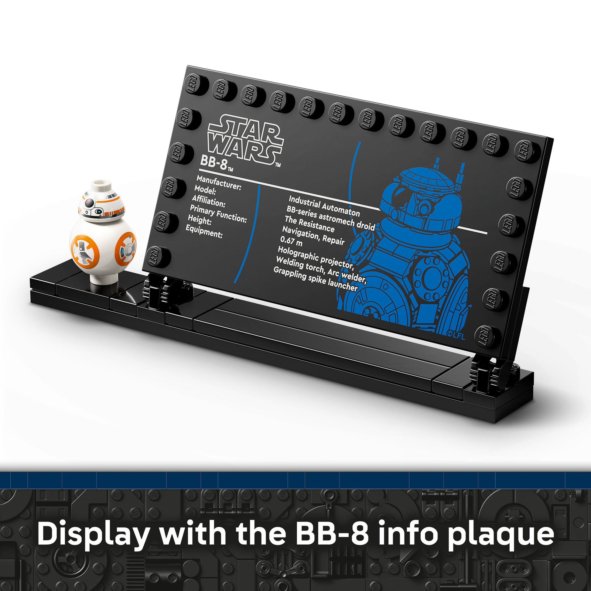 BB-8 LEGO® FIGURE – Display the main buildable toy model with the BB-8 info plaque and standard-sized BB-8 LEGO figure