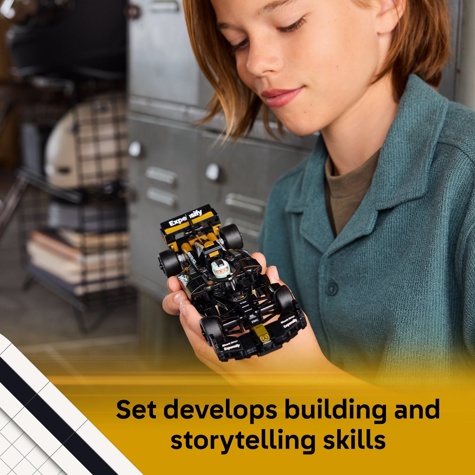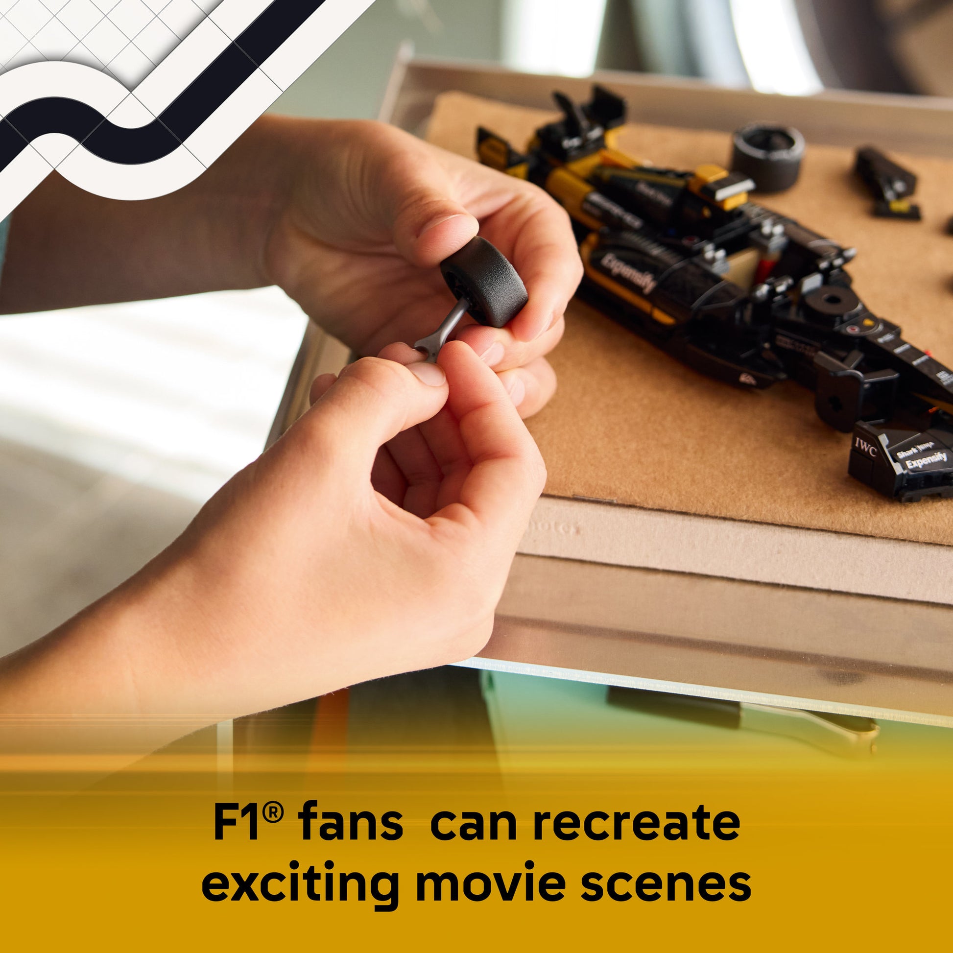 2 F1® DRIVER MINIFIGURES – Race car model kit with 2 minifigure characters from F1® The Movie: Sonny Hayes and Joshua Pearce, who both come with helmets featuring their signatures