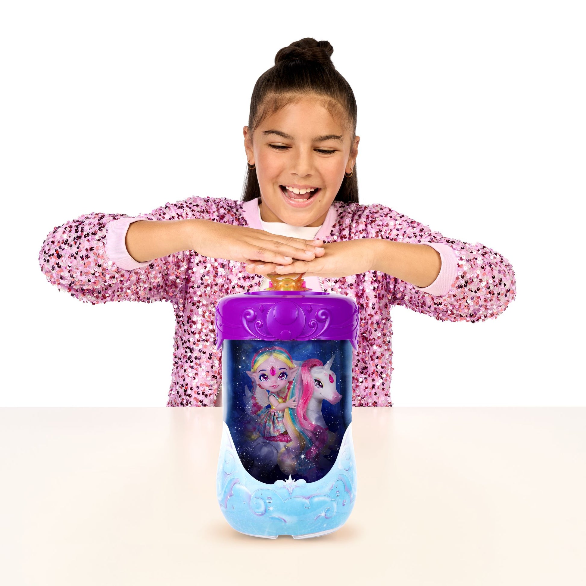 To make their potion, your child can combine water with the included magical ingredients in the potion bottle. The potion will bubble to become a shimmering, swirling dark blue mixture. Then say the magic words, "Magicus Mixus", while turning and pressing the crystal gem, and the potion becomes clear before their eyes, magically revealing their Pixling and her Pegacorn pet inside! That is double the fun in one magical potion! The enchanting duo are easily removed from their bottle, completely dry, and ready for your child to play with! Unia the Pixling has a crystal gem on her forehead and will always have her trusty Pegacorn Rainbow Star by her side.