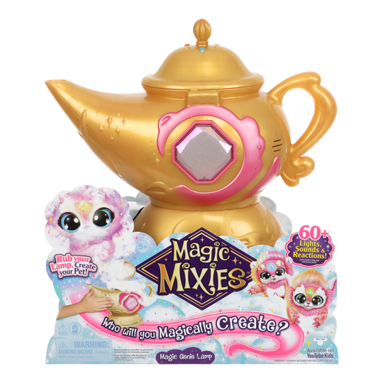 Real magic has returned in the form of the Magic Mixies Magic Genie Lamp! Inside this mysterious golden Magic Lamp is a pink Genie Mixie waiting to be released! It's time for your child to perform the magic steps and make real magic happen from this feature packed magical misting Genie Lamp with over 60 different lights, sounds and reactions!