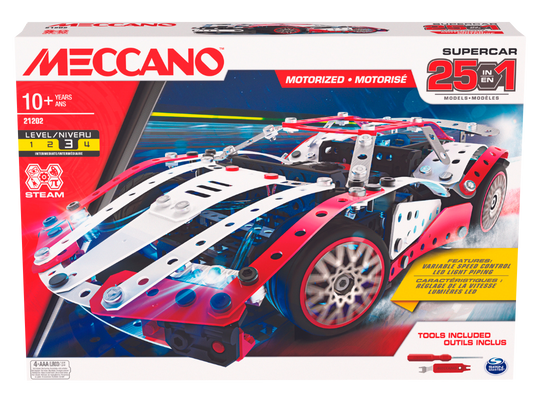As you construct your model cars, you’ll develop an understanding of science, technology, engineering, and math, while strengthening your hand-eye coordination, problem-solving and fine motor skills. The Meccano 25-in-1 Supercar Set offers a challenging yet rewarding building experience that kids and adults can enjoy together. Meccano toy building sets and educational toys are the perfect gifts for kids. Set requires 4 AAA batteries (not included). Build a supercar 25 different ways with the Meccano 25-in-1 Supercar Set!