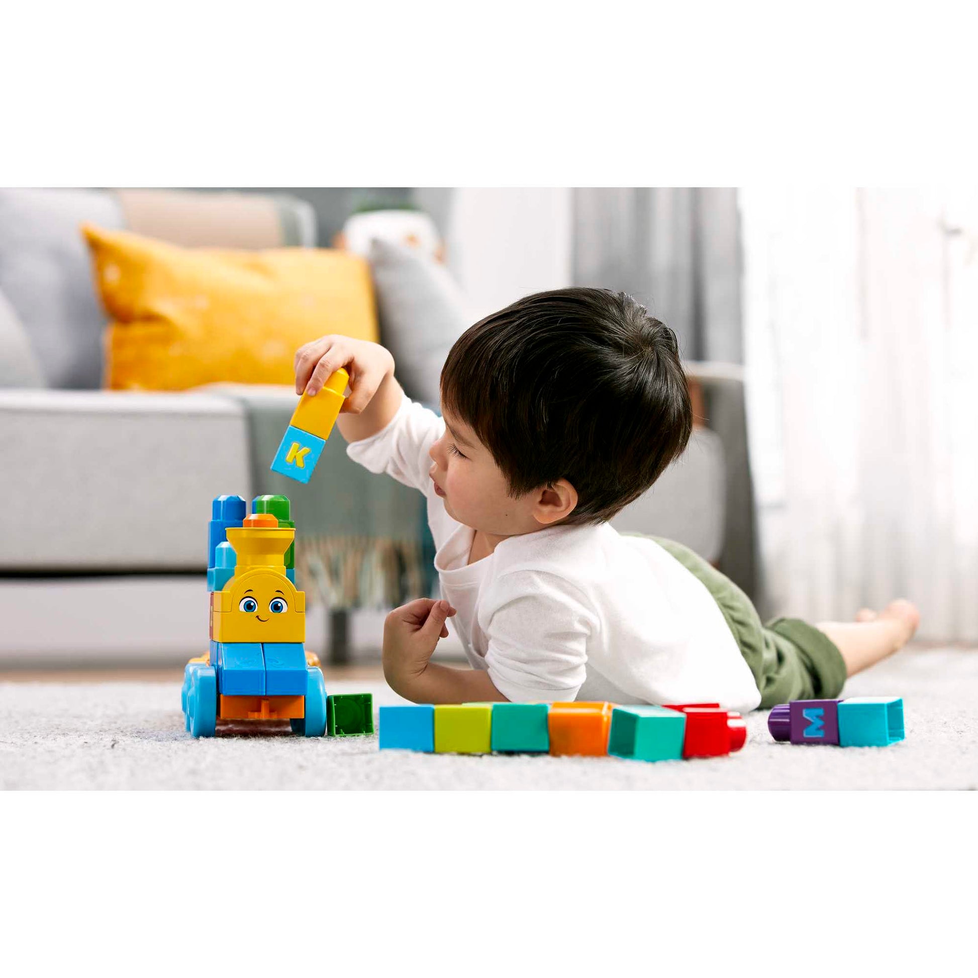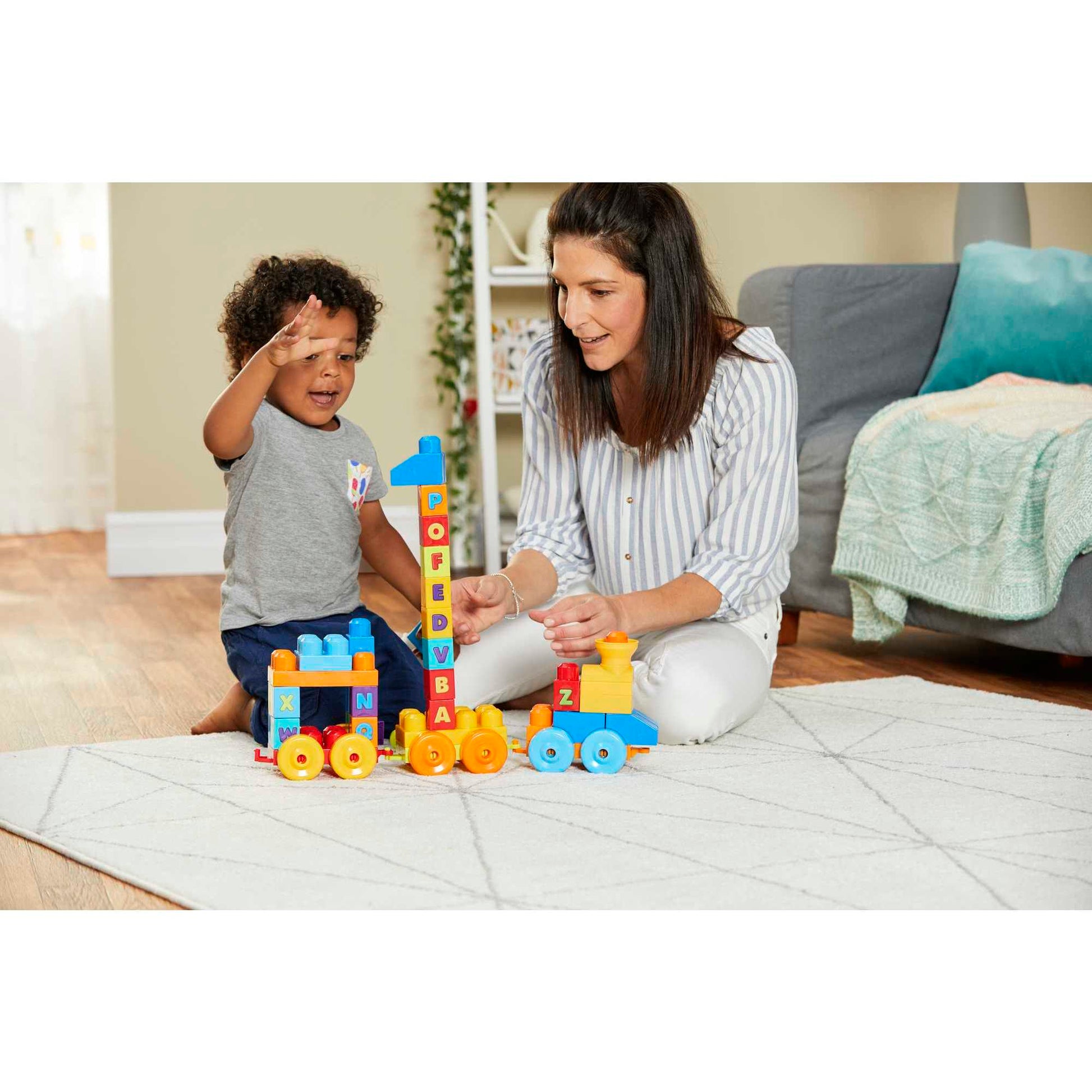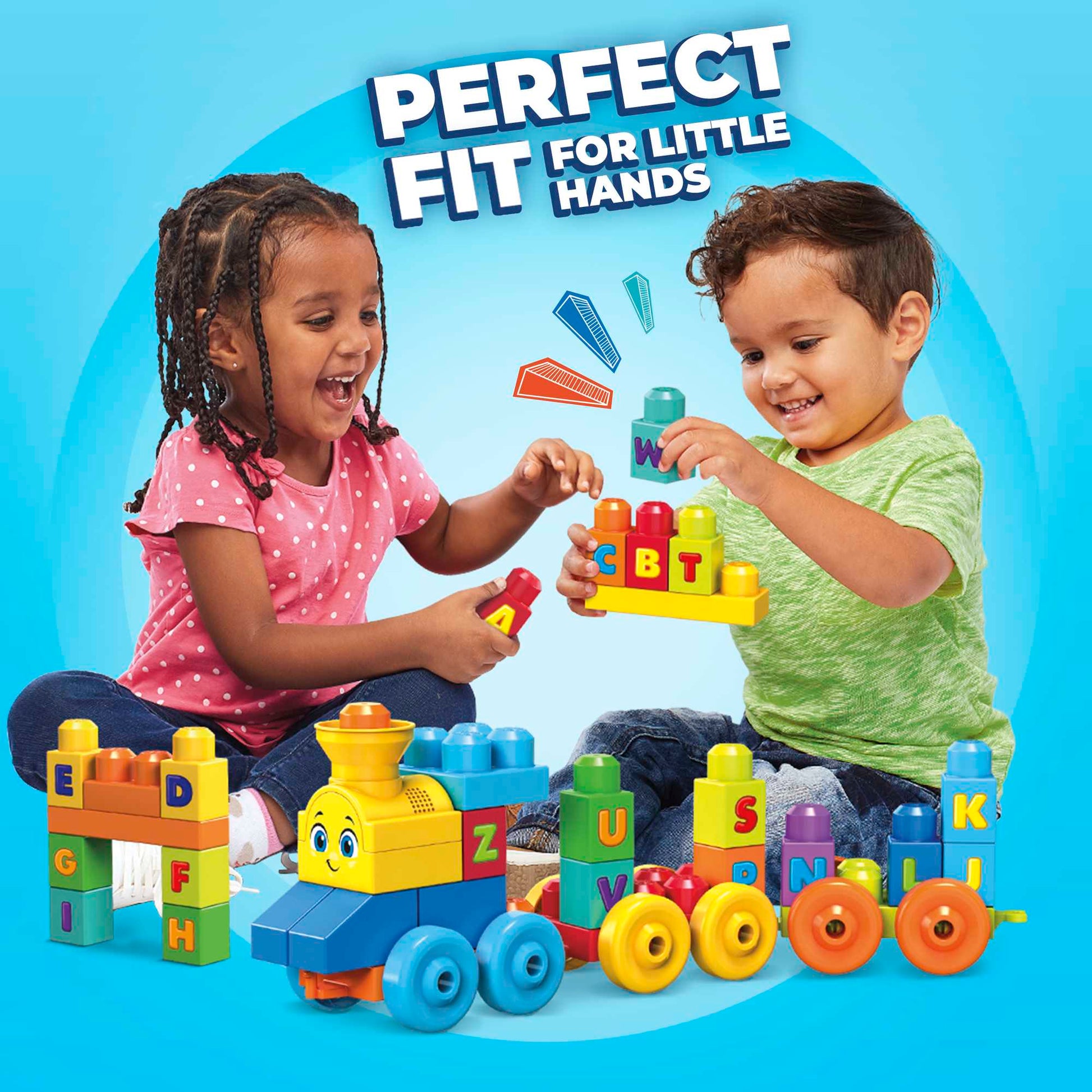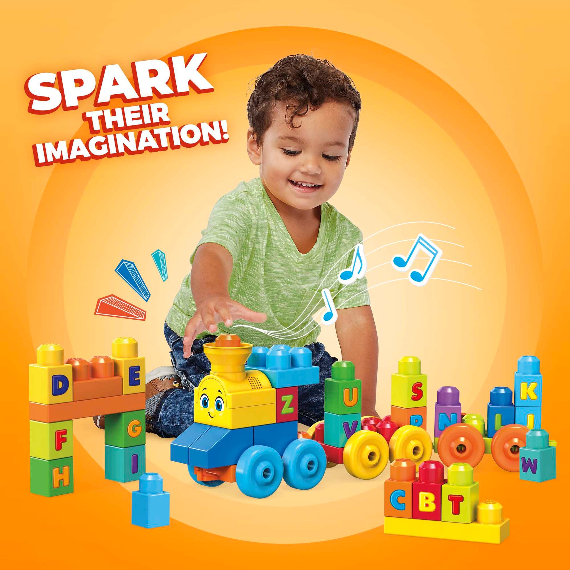 Connect the three rolling wheelbases together and stack the letter blocks on top to learn the alphabet or even build whole words. Then press down on the train's smokestack and discover real train sounds as well as a song to add musical magic to your alphabet adventure! Ideal for First Builders.