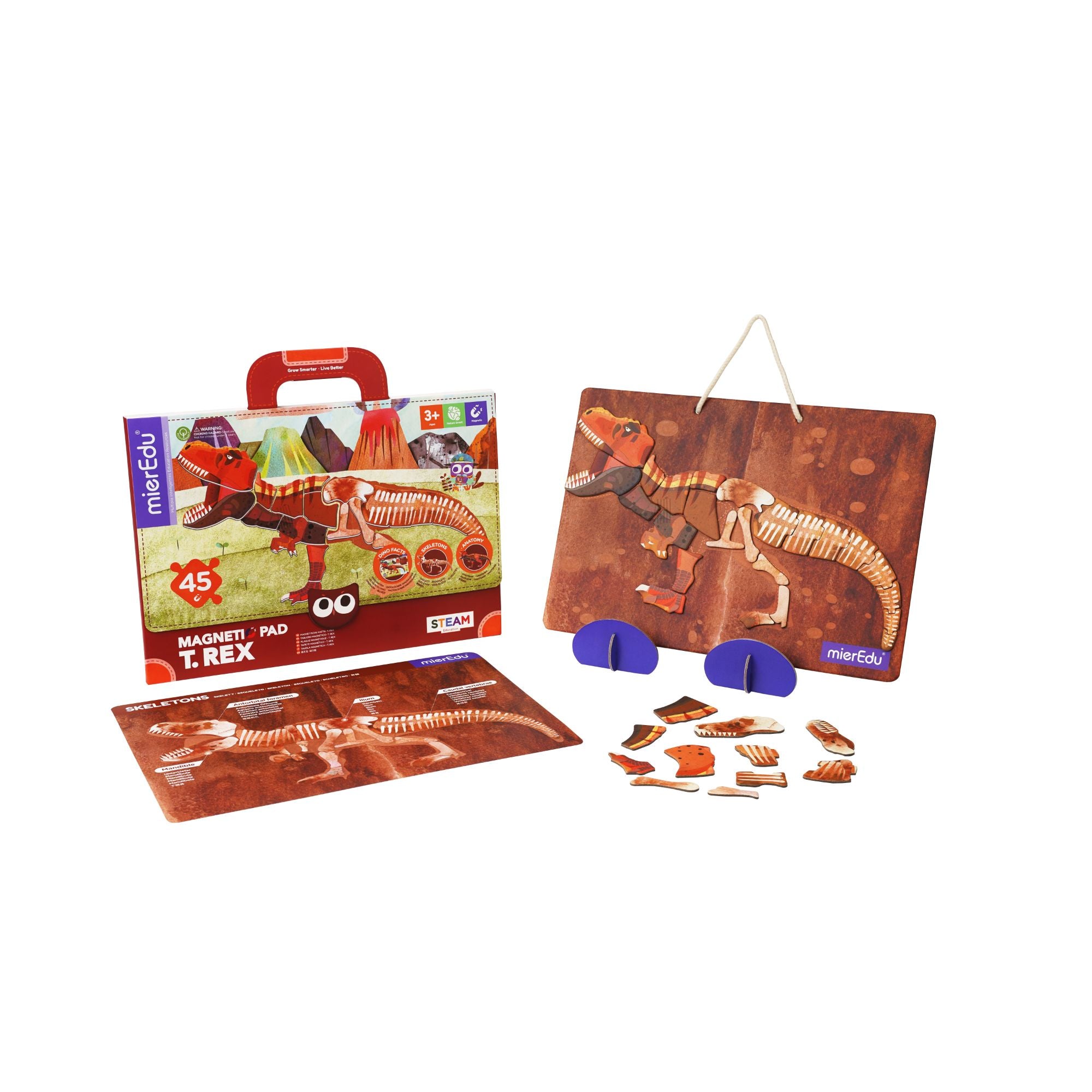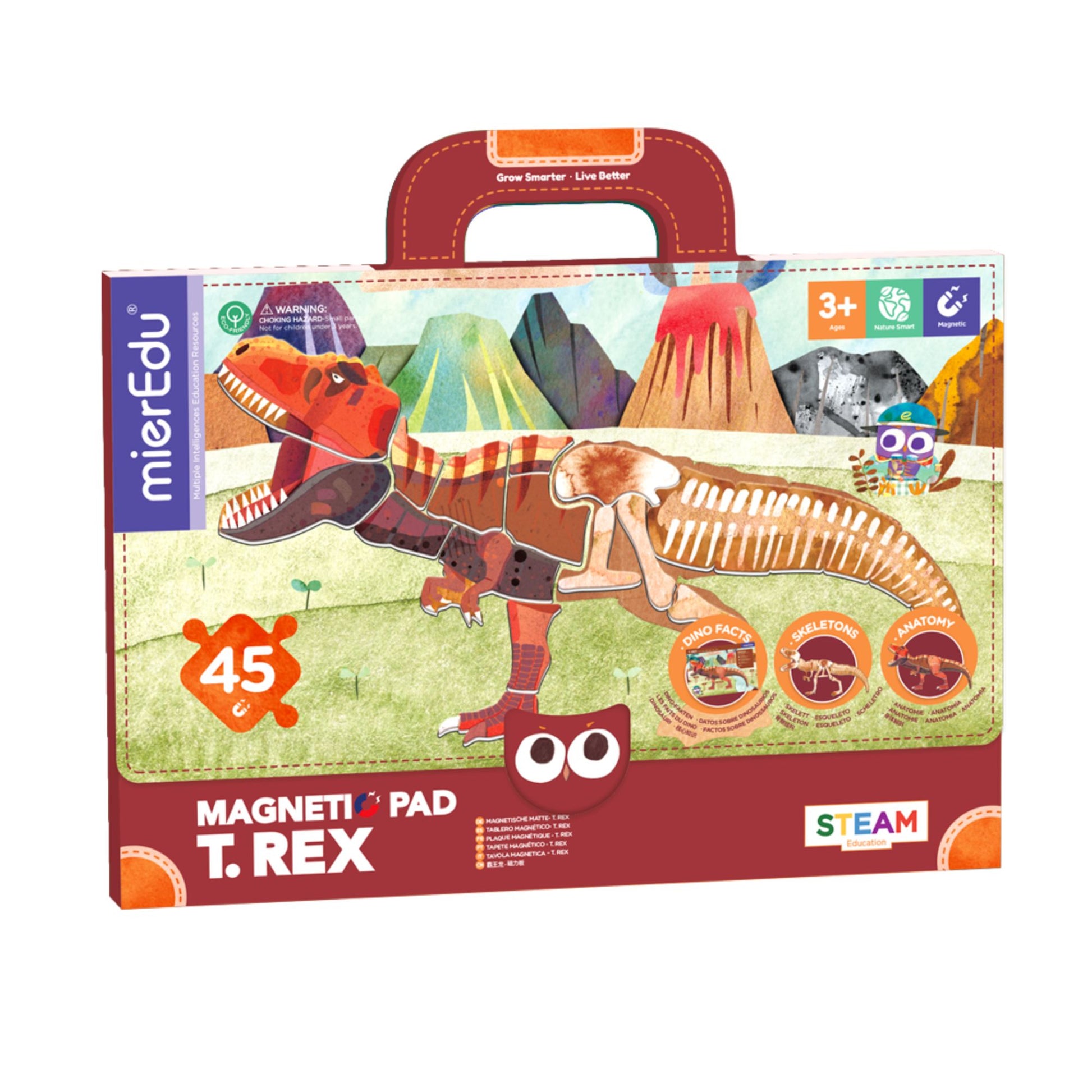 Introducing our educational mPad (magnetic pad), designed for beginners to learn the basics of the Tyrannosaurus rex (T. rex). This interactive learning tool features a magnetic puzzle of the T. rex's skin and bones, along with an anatomy card for further exploration.