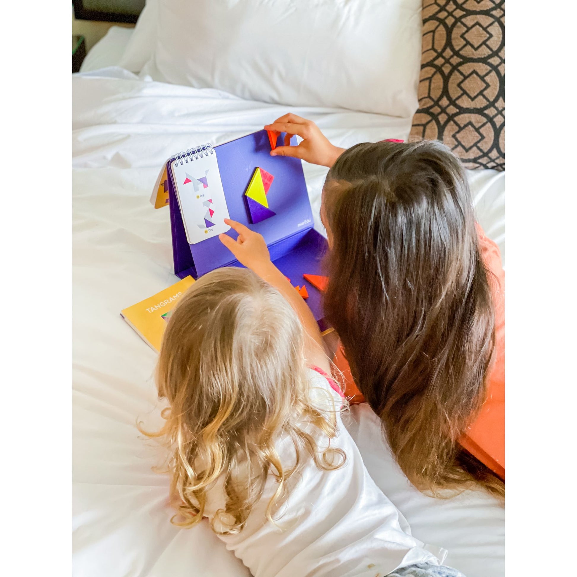 Magnetic Tangram Battle Kit, featuring 100 challenges across various difficulty levels. This two-player game combines geometry knowledge with exciting and relevant problem-solving, motivating children to learn while having fun.