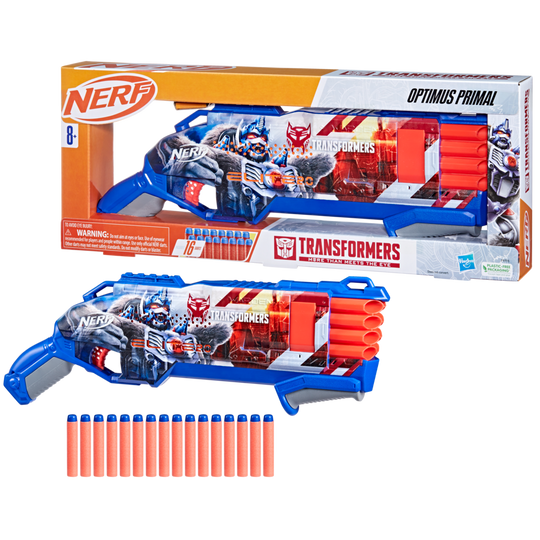 Blast into battle with the Nerf Transformers Optimus Primal dart blaster that’s decorated with bright, bold Transformers and Optimus Primal designs on both sides of the blaster! It's a perfect addition to any Transformers collection and an exciting blaster for Nerf outdoor games. The blaster has 8 barrels and fires 2 darts at once for a double dose of dart-blasting fun.