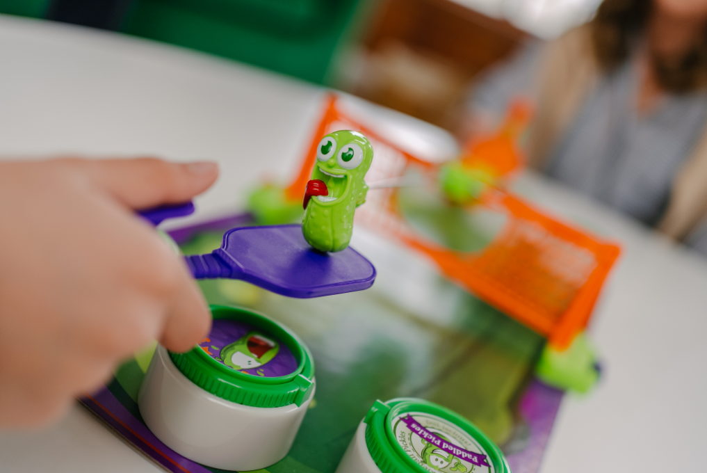 The aim of the game is to flip the lid of your opponent's Pickle Jars with the Pickle! Each player has 3 Pickle Jars in their court. The first player to flip over two of the three Pickle Lids on your opponent's side scores! When you lose a point you need to say ""I've been pickled!"" Players can track their score on the Score Slider on the side of the Pickle Board. First player to 4 points WINS!