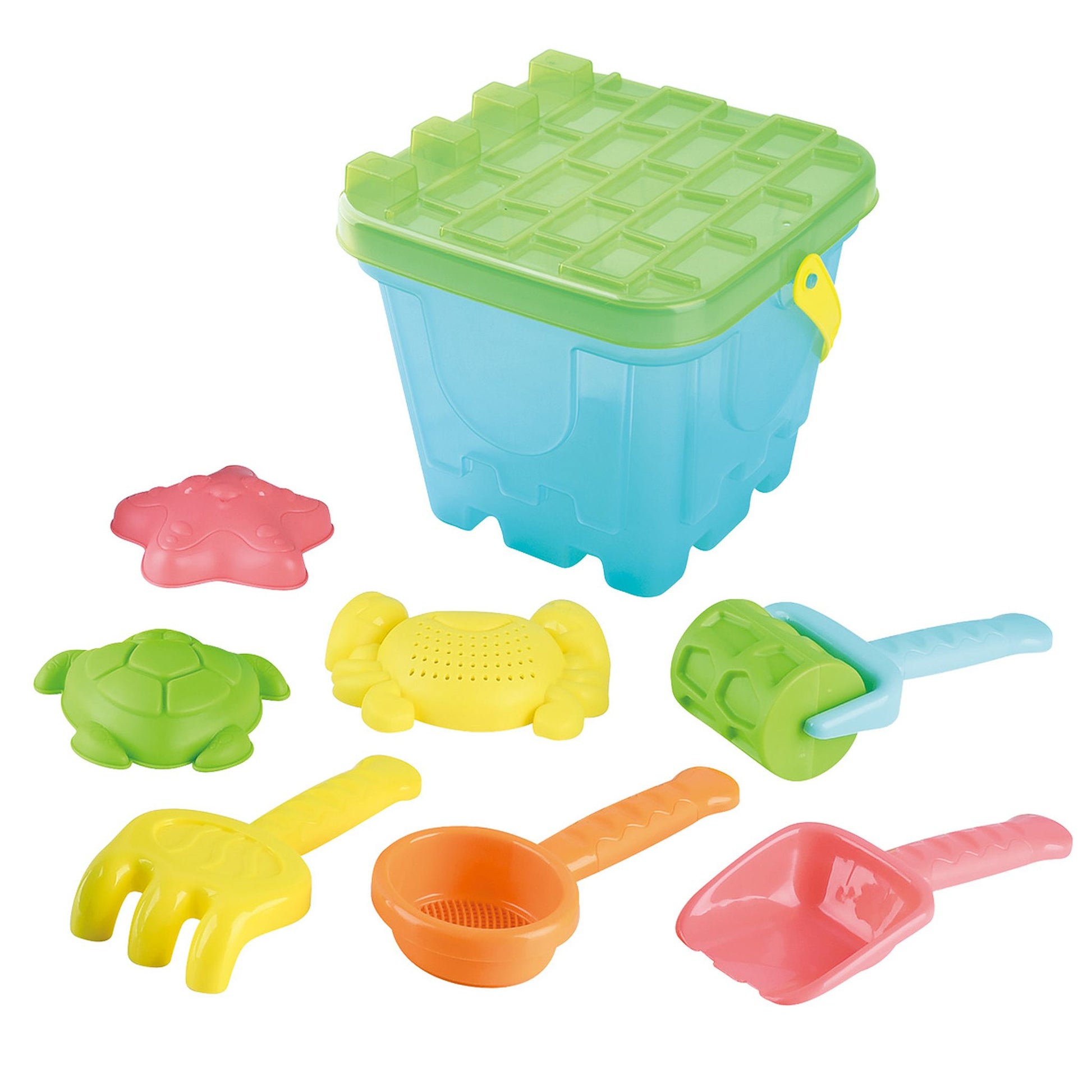 Set includes a bucket, rake, spade, sieve, sand roller, and 3 sea creature moulds.
