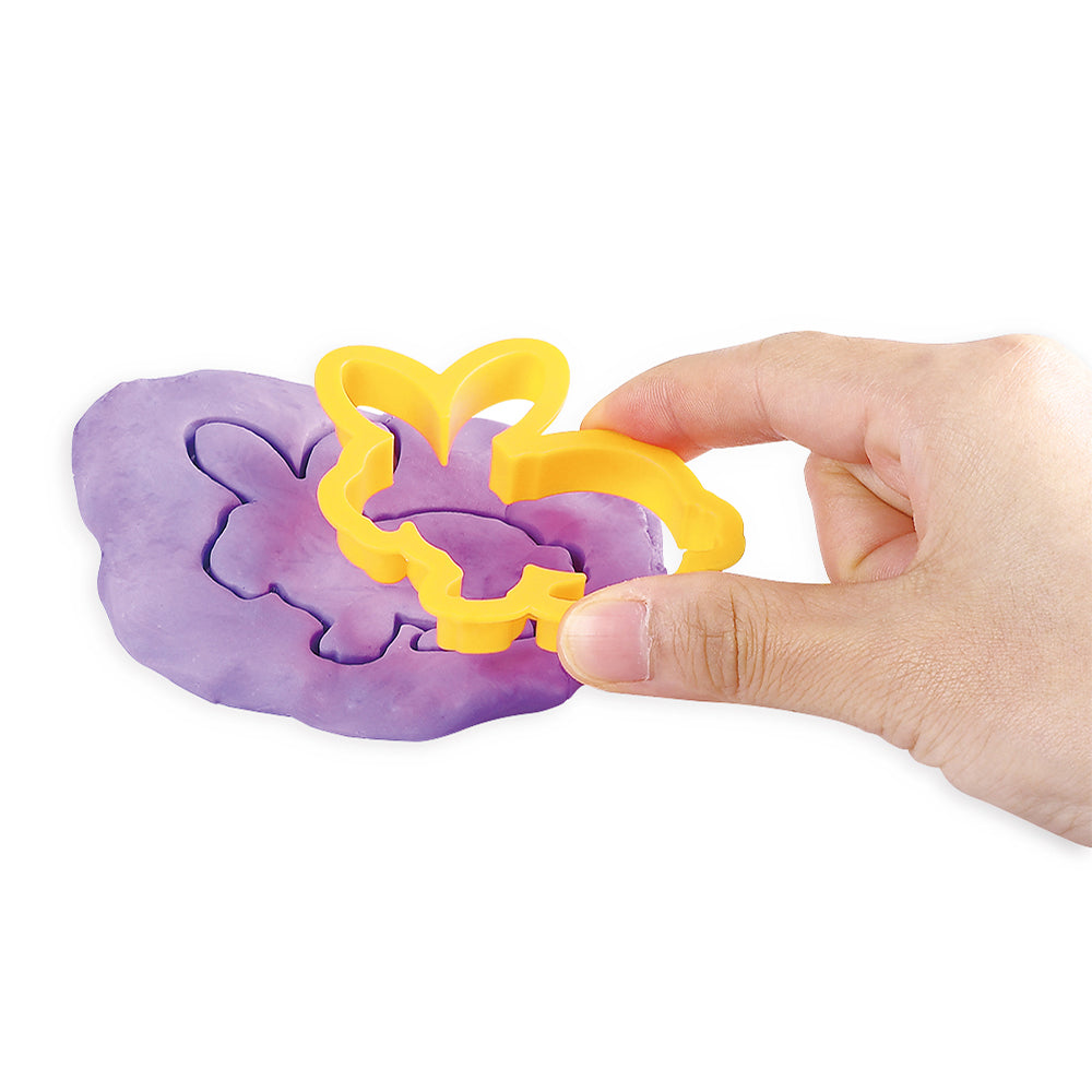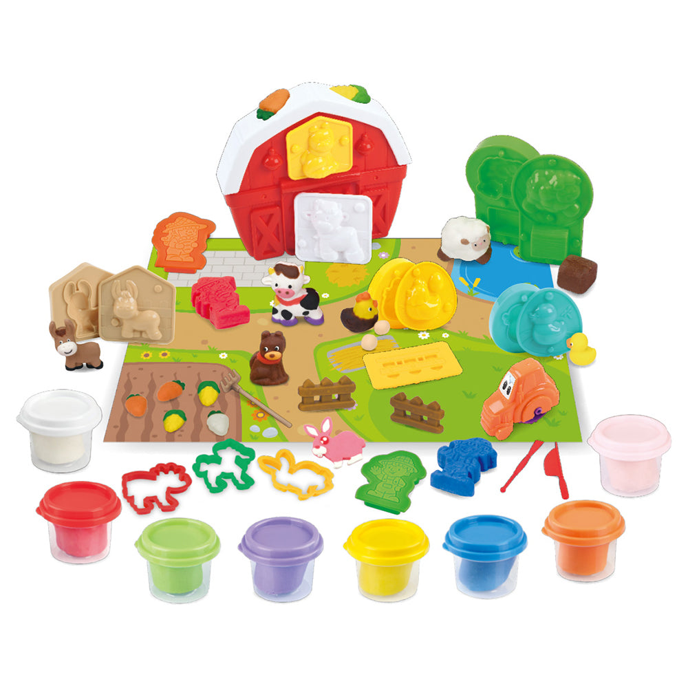 The Barnyard Friends includes: 30 pieces gluten free dough, three animal cutters, a hen, donkey, farmer boy and girl, duck, sheep and hay, a truck with rolling wheels, a farm house with dog and cow mould, a fence mould, three modelling tools, a play mat and eight tubs of rice-based dough.