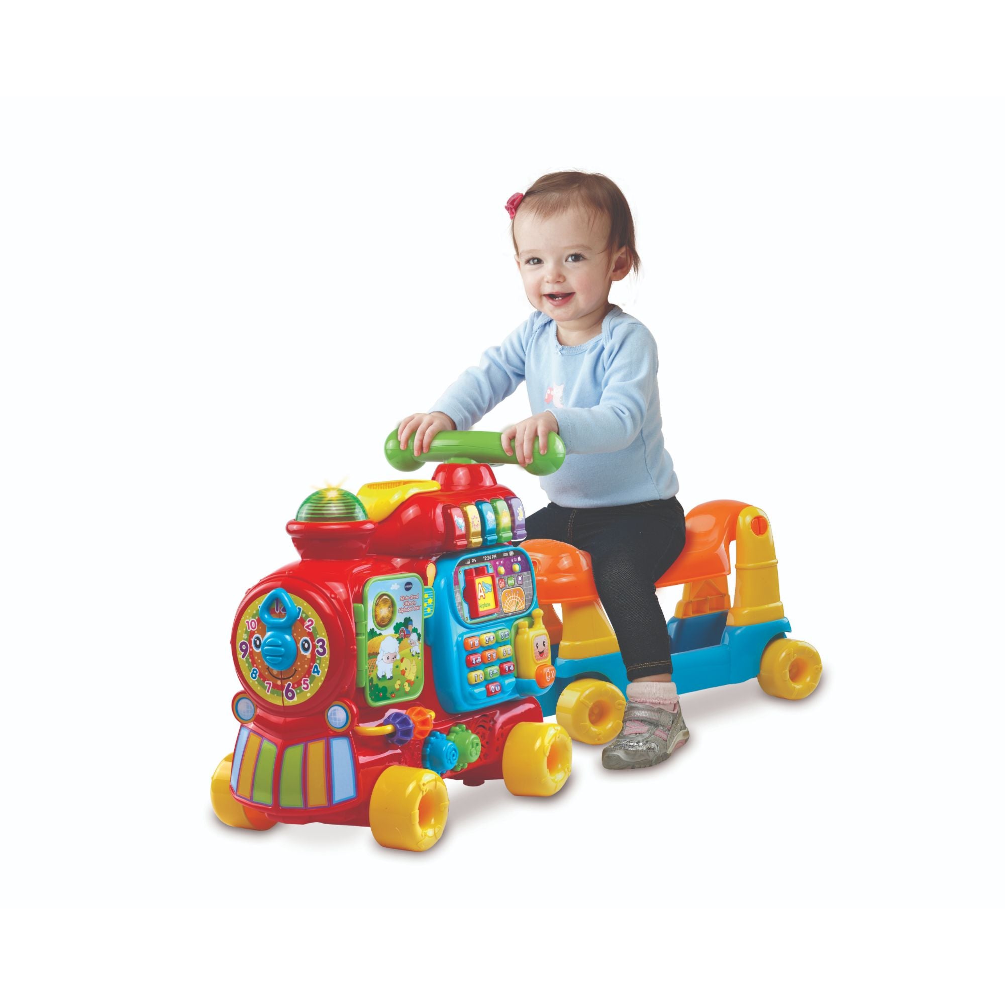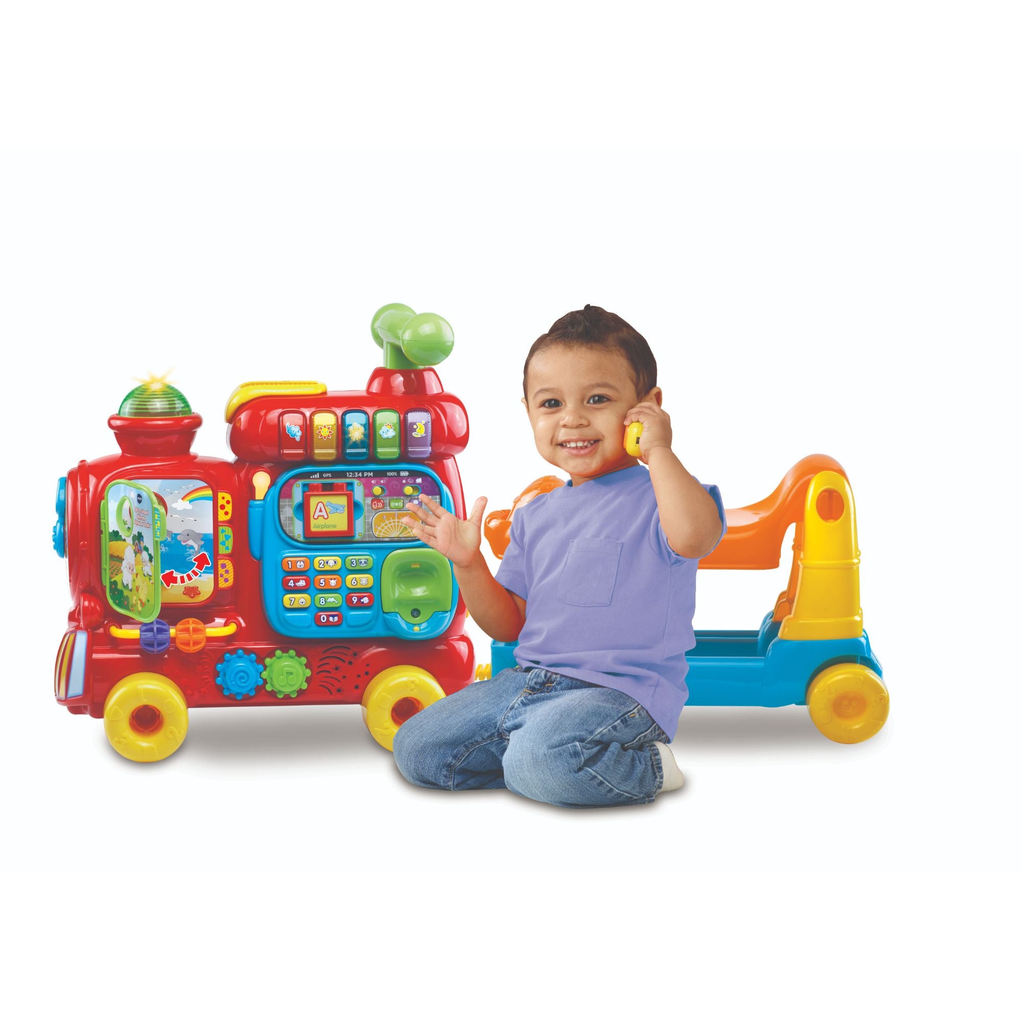 4-in-1 grow with me alphabet train includes modes for sit-down play, walker, pull-along wagon and ride on.