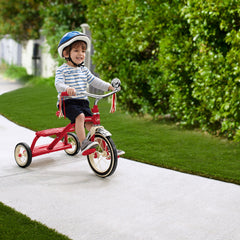 From the chrome handlebars and fender to the playful streamers and deluxe ringing bell, the classic style of this tricycle is a timeless icon of childhood.The adjustable seat on the Classic Red Dual Deck Tricycle™ grows with your child to ensure years of fun play. Watch your child develop from rookie rider to tricycle expert as they practice and grow.