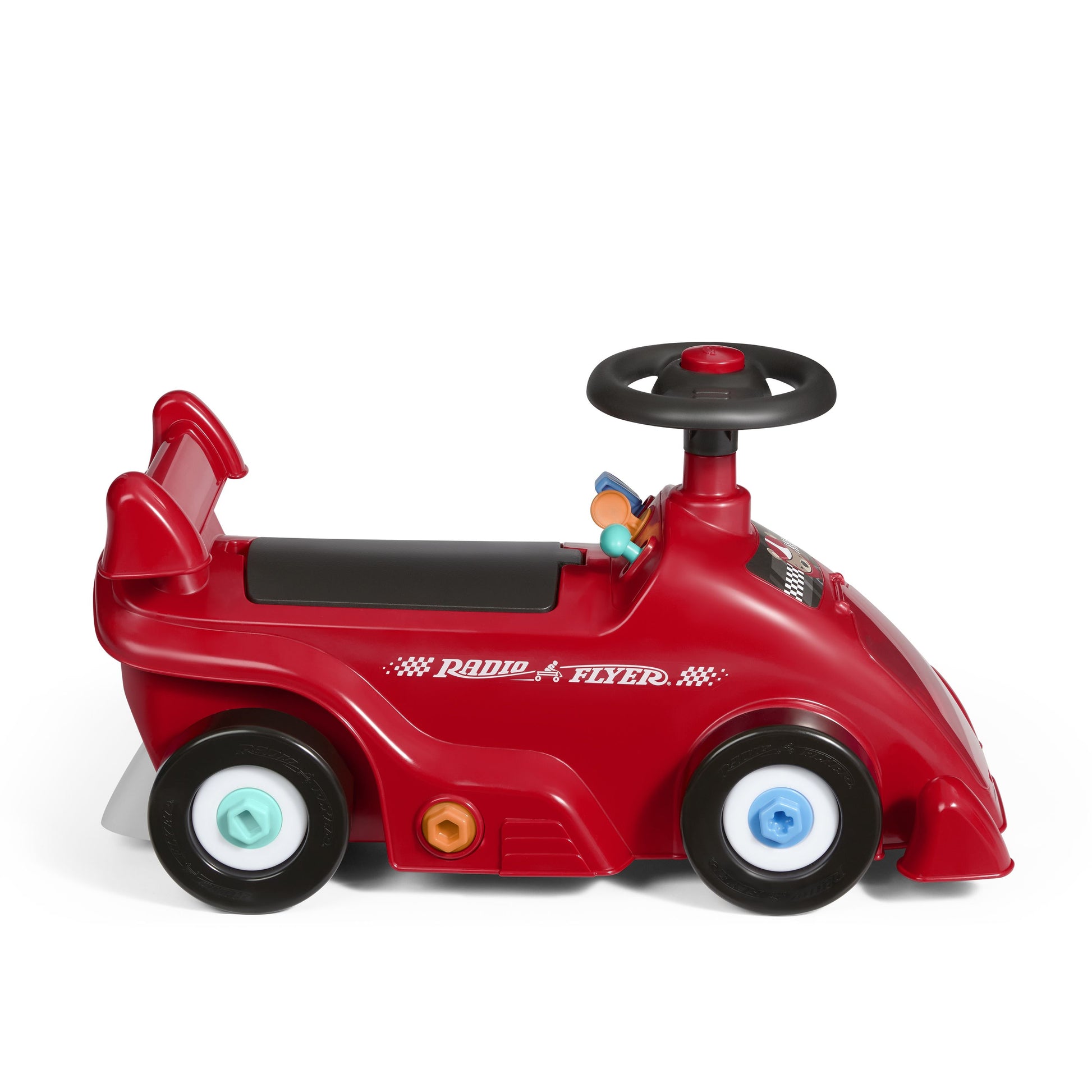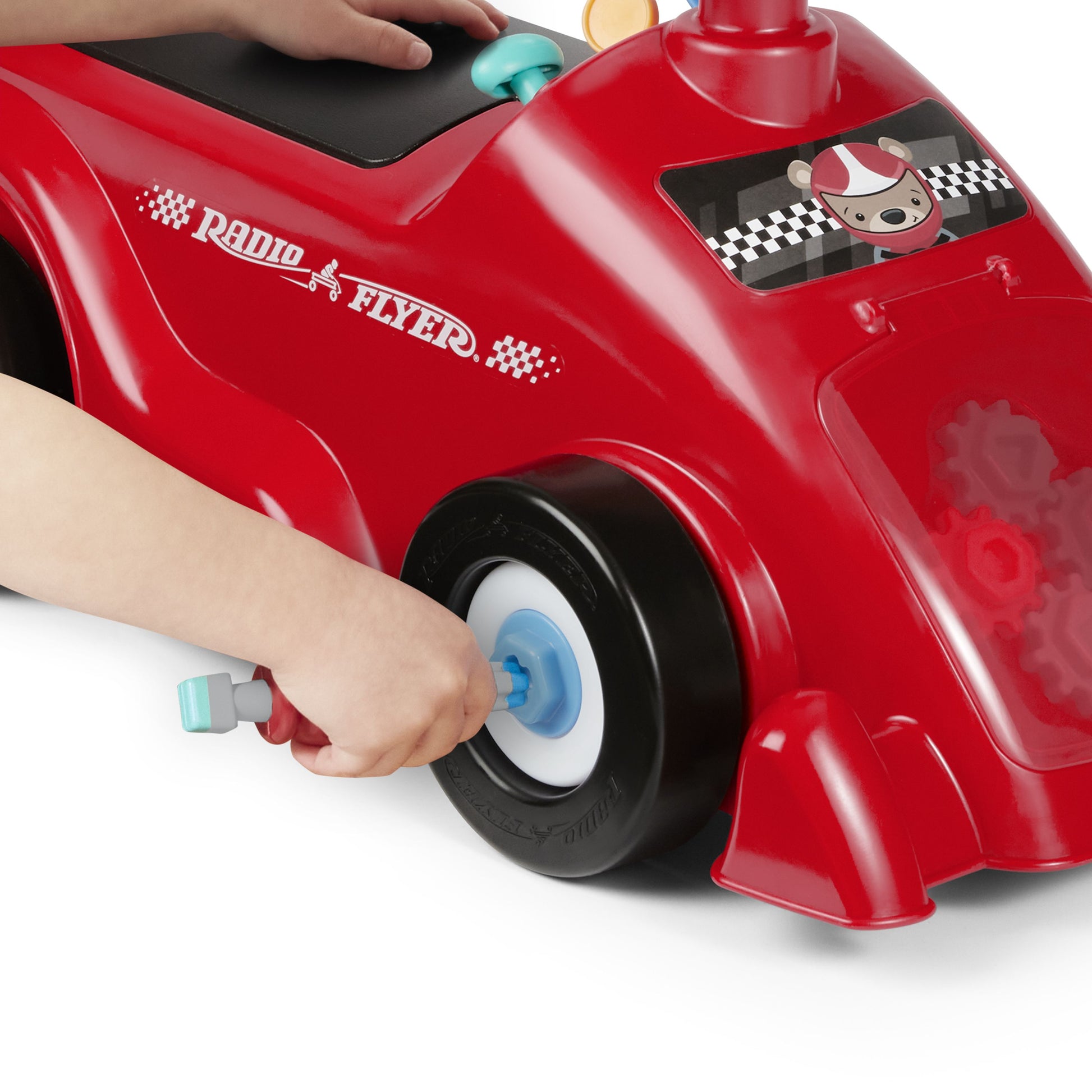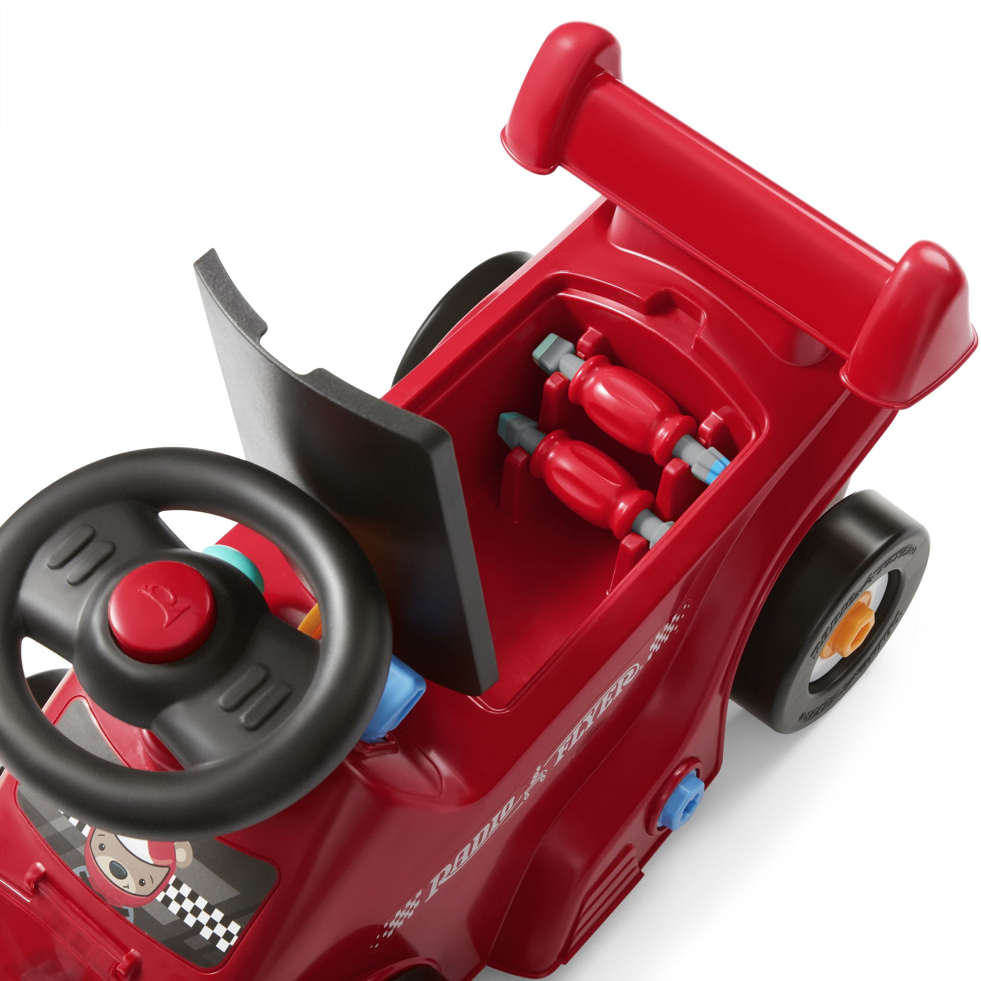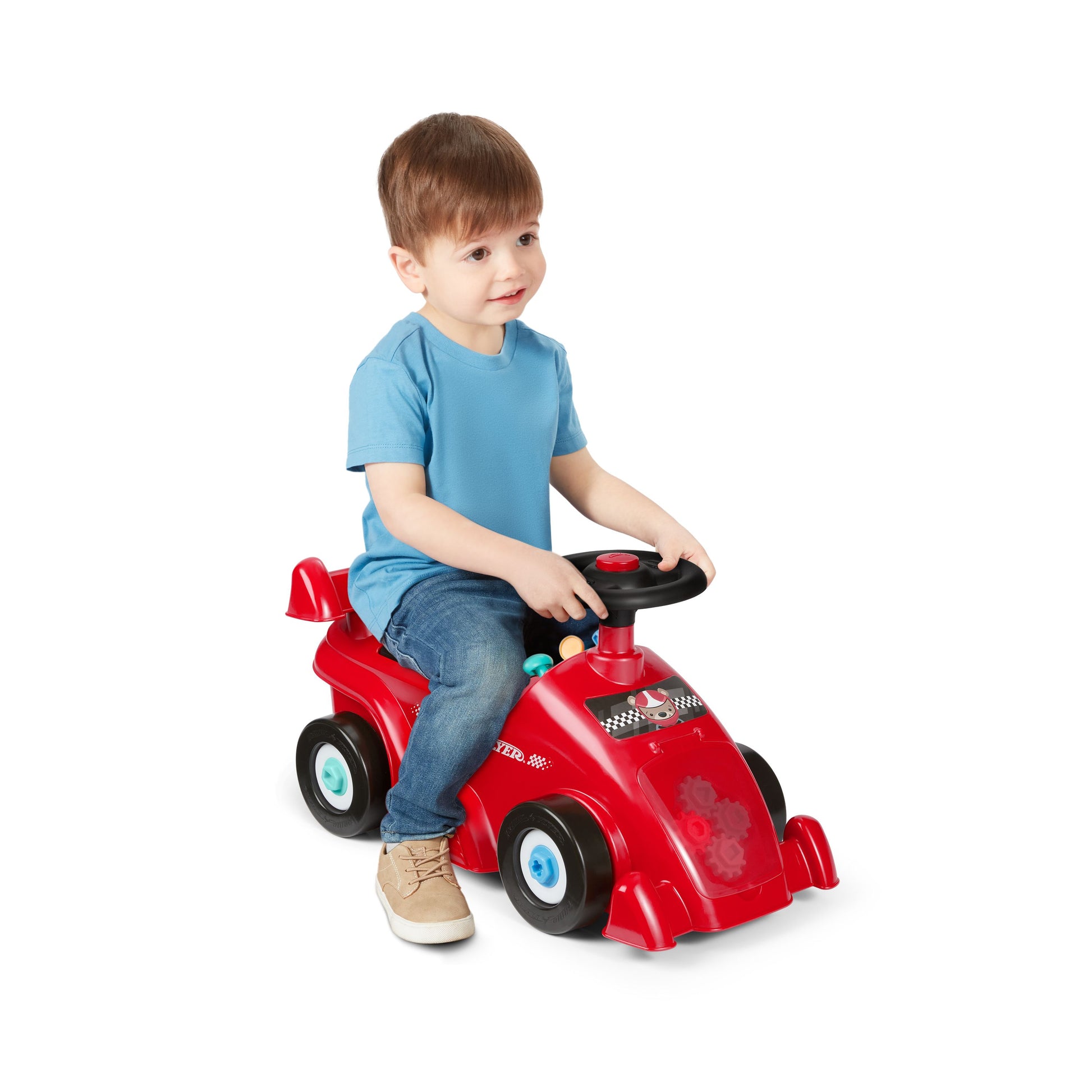 Coming to a racetrack near you, introducing Radio Flyer’s Pit Stop Play! This racing themed ride-on offers two exciting ways to play –a foot to floor ride-on or using the included tools to “fix” and service the car! It features 15 interactive touchpoints that encourage problem solving and imaginative play. The included tools are colour coded and have four unique ends that match with gears and gadgets on the car. The interactive features have varying complexity to promote continuous learning and development. Kids can practice shapes, colours, and develop fine motor skills all while having fun. This ride-on provides a fun and educational experience, ensuring hours of entertainment and valuable development for toddlers. Maximum weight capacity 42 lbs.