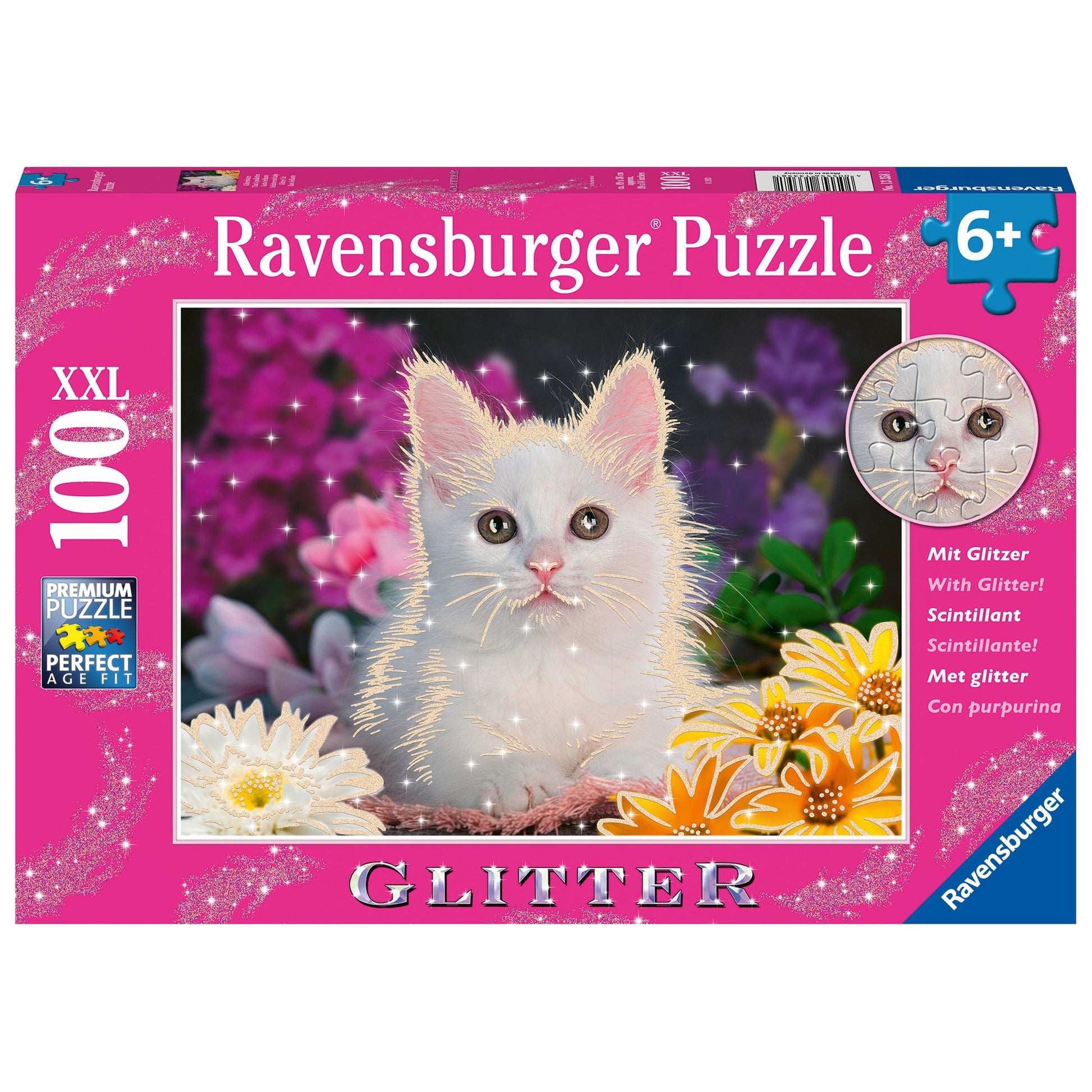 Ravensburger Glitter Cat 100pc puzzle is a delightful and sparkly puzzle that features a beautiful cat adorned with glitter. It is perfect for children aged 6 years and above who love pets and enjoy the challenge of putting together a puzzle.