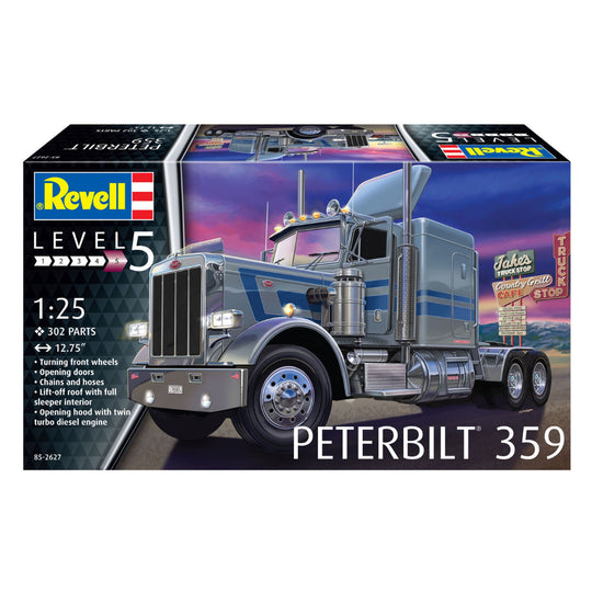 Peterbilt has been a leading manufacturer of high-quality heavy-duty trucks in the USA since it was founded in 1939. heavy-duty trucks in the USA. All Peterbilts are built with the same commitment to quality, inside and out. quality inside and out. The highly adaptable 359 Conventional, designed for cross-country haulage is available in two different lengths. The 359-13 has a fibreglass bumper and bonnet, which are made of fibreglass, which are made of metal on the 359-19. The Peterbilt 359 "Bull Nose" is a typical