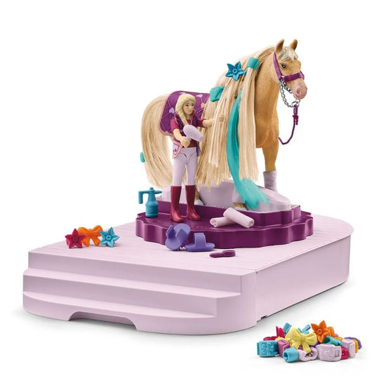 The wellness session in the horse grooming station is going so well, the horse doesn’t want to leave. The beauty horse is really enjoying all the brushing and sponging. To help the mane and tail dry faster, there’s a hairdryer waiting in the drawer. Now the styling can begin. You can add beads, bows or flowers and there’s even an extra strand of hair. To make sure everyone knows you belong together, the horse and rider have a matching look: the horse blanket and vest have the same pattern and even the gaiters match the armband.