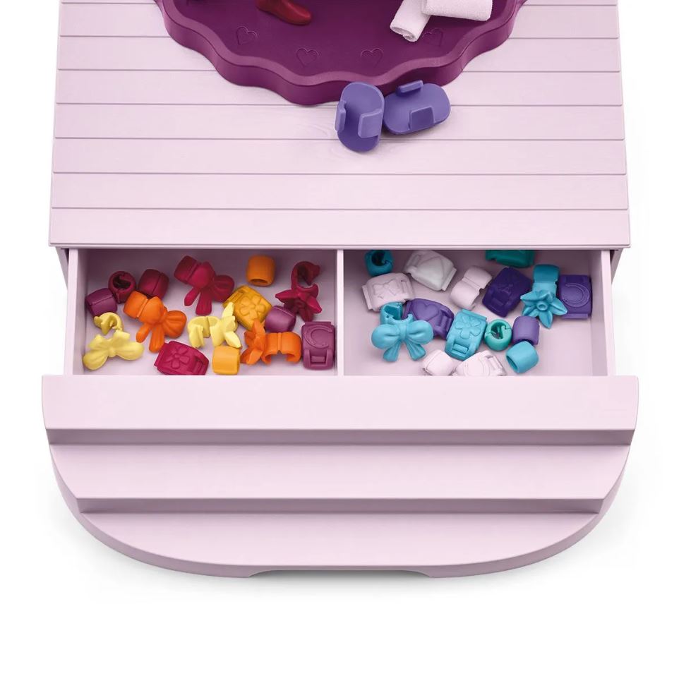 1x Beauty Horse, 1x human figure, 1x horse grooming station, 1x drawer, 12x hair clip, 14x hair pearl, 4x hair flower, 4x hair bow, 1x finger comb, 1x finger sponge, 1x hair brush, 1x hair dryer, 1x horse blanket, 1x vest, 1x hair strand, 4x gaiters, 1x bracelet