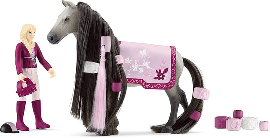 1x Trakhener Mare with brushable mane and tail, 1x fully flexible Figure Sofia, 1x horse blanket, 1x riding hat, 1x hairclip, 1x hair beads, 1x clip-on hair piece, 1x finger brush