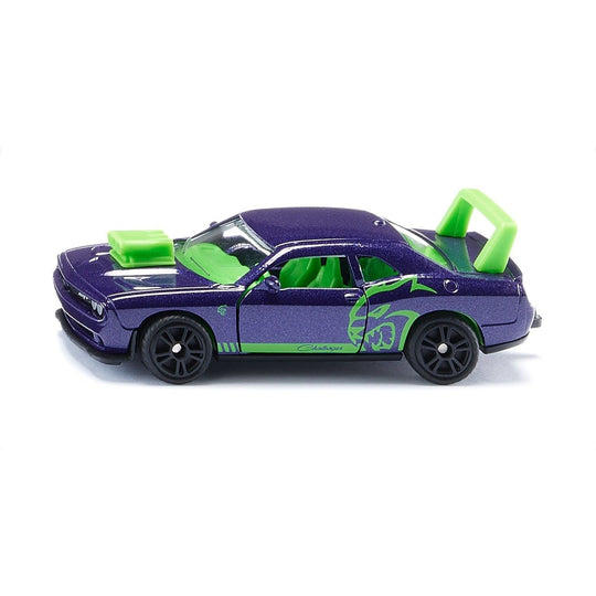 A textbook example of a muscle car: The Dodge Challenger Hellcat Custom. The elaborate paintwork alone is a highlight in itself: The original Dodge Plum Crazy lilac colour stands in glaring contrast to the dazzling green on the huge rear spoiler, the impressive blower on the bonnet, and the interior. On top of that come the awe-inspiring Hellcat paintwork on the sides, and the black sports rims (with rubberised tread) – a high-speed dream come true!