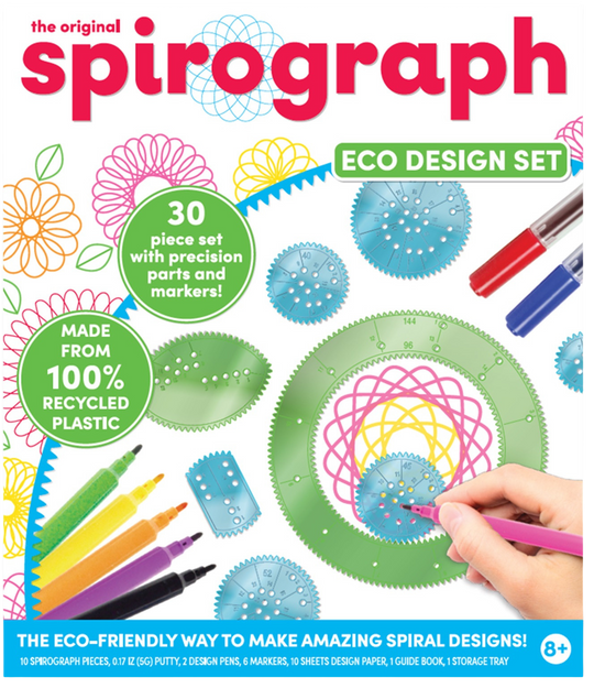 Made from 100% recycled plastics!The original Spirograph design set is now available in an Eco Set but still lets you use it the classic way to create countless amazing designs!The 30 piece set features precision parts, pens and reusable Spiro-Putty! Spiro-Putty holds the fixed position Spirograph pieces securely in place on the paper for precision detailing!