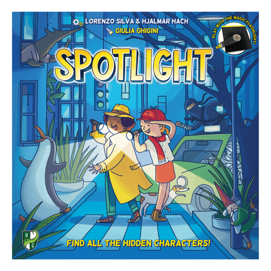 In Spotlight your goal is to find as many as possible to advance your pawns on the track and cross the finish line, without any player being reached by the Moon pawn that is chasing you.
