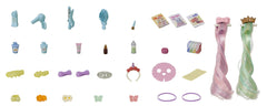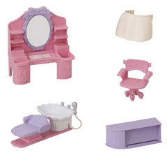 Box Contents: Main Unit, Stairs, Dresser, Dresser Chair, Shampoo Basin, Counter, Cape, Hairbrush, Hairdryer, Curling Iron, Hair Extensions (Pink), Hair Extensions (Blue), Unicorn Alice Band, Tiara, Hair Clip (Star), Hair Clip (Ribbon) x2, Hair Clip (Jewel), Hair Tie x2, Hair Claw (Pink Butterfly), Hair Claw (Mint Butterfly), Hair Claw (Daisy), Hair Claw (Primrose), Ponytail Ring, Shampoo, Conditioner, Hair Treatment, Hair Oil, Hairspray, Hair Wax, Hair Dye, Towel, Face Mask, Magazine x3, Telephone, Makeup Brush, Manely Pony girl, Hair Styling Book