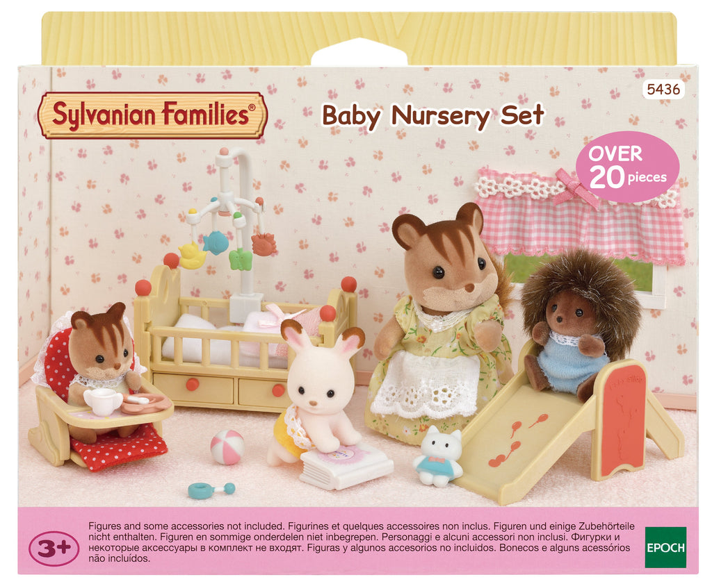 The Baby Nursery Set is a perfect furniture set to add to your Sylvanian Families house. The set comes with a cot, high chair, and slide for a cute nursery room. The mobile can be attached to the cot. Accessories such as a bottle, plate, and toys are also included. Add the Baby High Chair and Baby Jungle Gym for a more playful nursery room (sold separate). Figures not included.