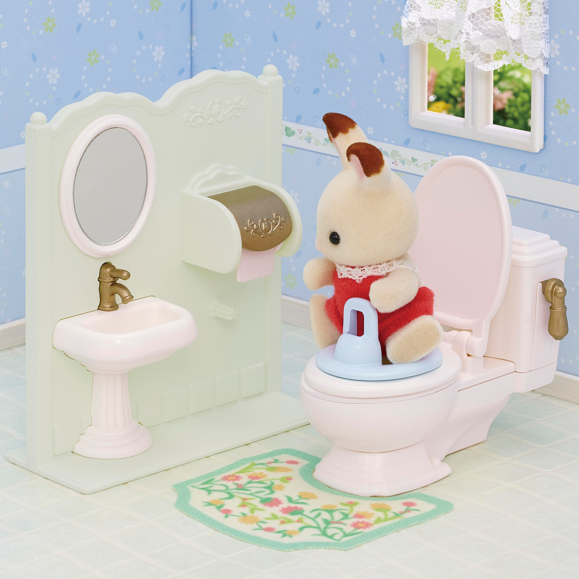 This little Toilet Set contains a cute little toilet, partition with sink unit, a toilet mat, a storage rack for all your bathroom bits and bops, a toilet paper holder, two rolls of toilet paper, a toilet brush and toilet brush cover. It includes a mini bottle of detergent so your Sylvanians can keep everything spick and span.