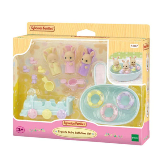 Set of three newborn rabbit triplet babies with baby bath & toy train.