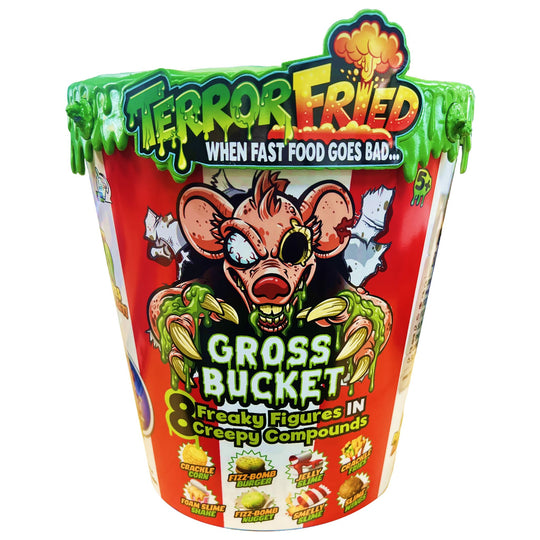 Welcome to Terror Fried… The nastiest, gnarliest, creepy critters and crusty crawlers from deep inside the fast food fryer. Get more than you bargined for with the Terror Fried Gross Bucket! With a huge 8 freaky figures to find in a variety of creepy compounds, the Gross Bucket allows you to fizz, squish, crack and ooze as you play through multiple layers of discovery and jump scare reveals.