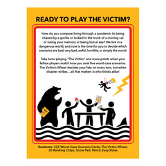 Take turns playing "The Victim" and score points when your fellow players match how you rank five worst-case scenarios. The Victims Wheel decides your fate on every turn, but when disaster strikes all that matters is who thinks alike!