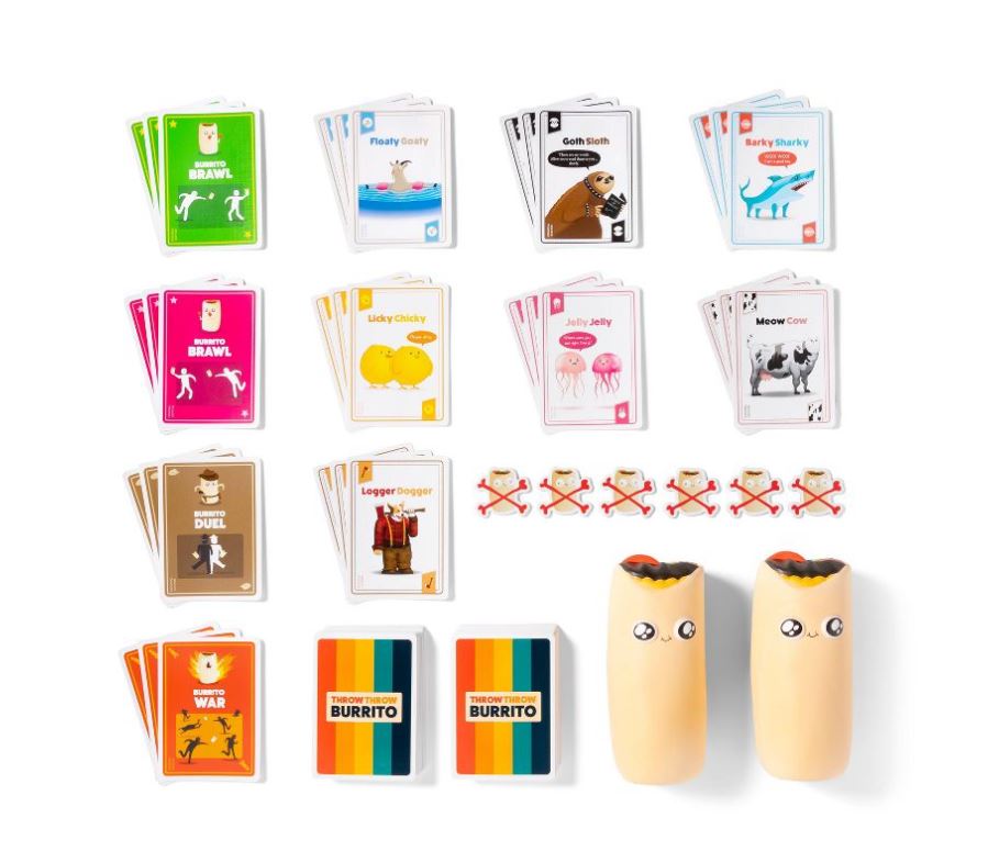 How it works: Place a pair of burritos on a table and draw cards. Keep your cards a secret. Rack up points by finding sets of three in the deck. Find matches before anyone else does. If someone plays Burrito Cards, a Battle ensues. Steal points from your opponents by hitting them with squishy toy burritos. Declare war on your friends. Some battles only involve a handful of players. Others force the entire table to engage in a Burrito War. Duel to determine the winner. During a Burrito Duel, two players must stand back to back, walk three paces, and FIRE.