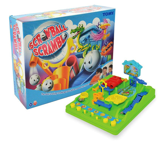 Race to beat the clock as you take on the Screwball Scramble through this topsy-turvy maze! Use skill and coordination to maneuver your marble through the crazy obstacle course: rock it across a tilting walkway, swing it across with the crane, shimmy over the parallel bars, wobble across the table maze and more! Designed for 1-4 players, you can challenge yourself to beat the clock or challenge a friend to see who's fastest.