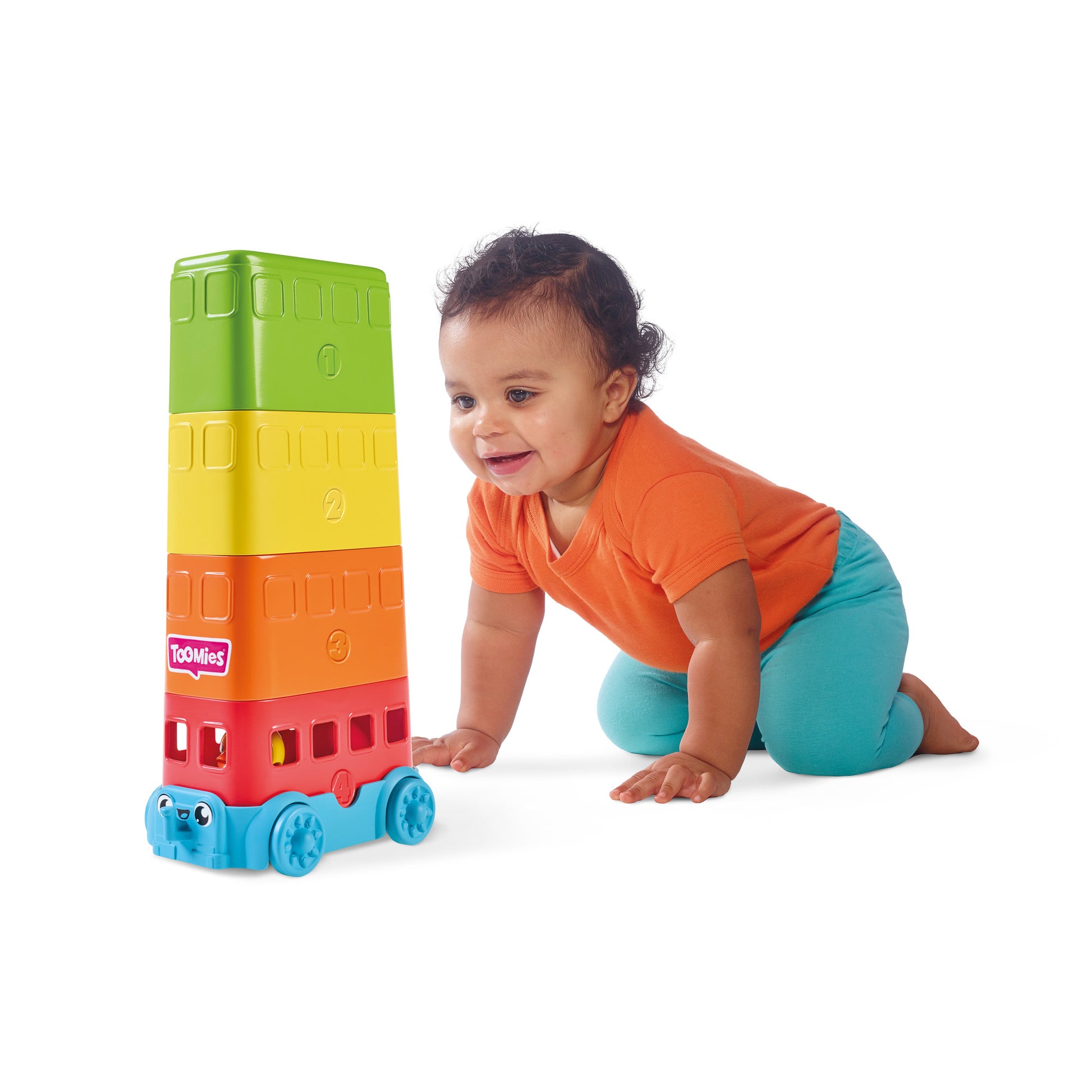 Tomy Stacker Decker Bus can grow into a double-decker, a triple-decker or even a double-double-decker made up of four colourful floors. Each one fits onto the next. Each deck from the base up has two ‘seats’ reserved for the characters that make up the Hide & Squeak egg collection.