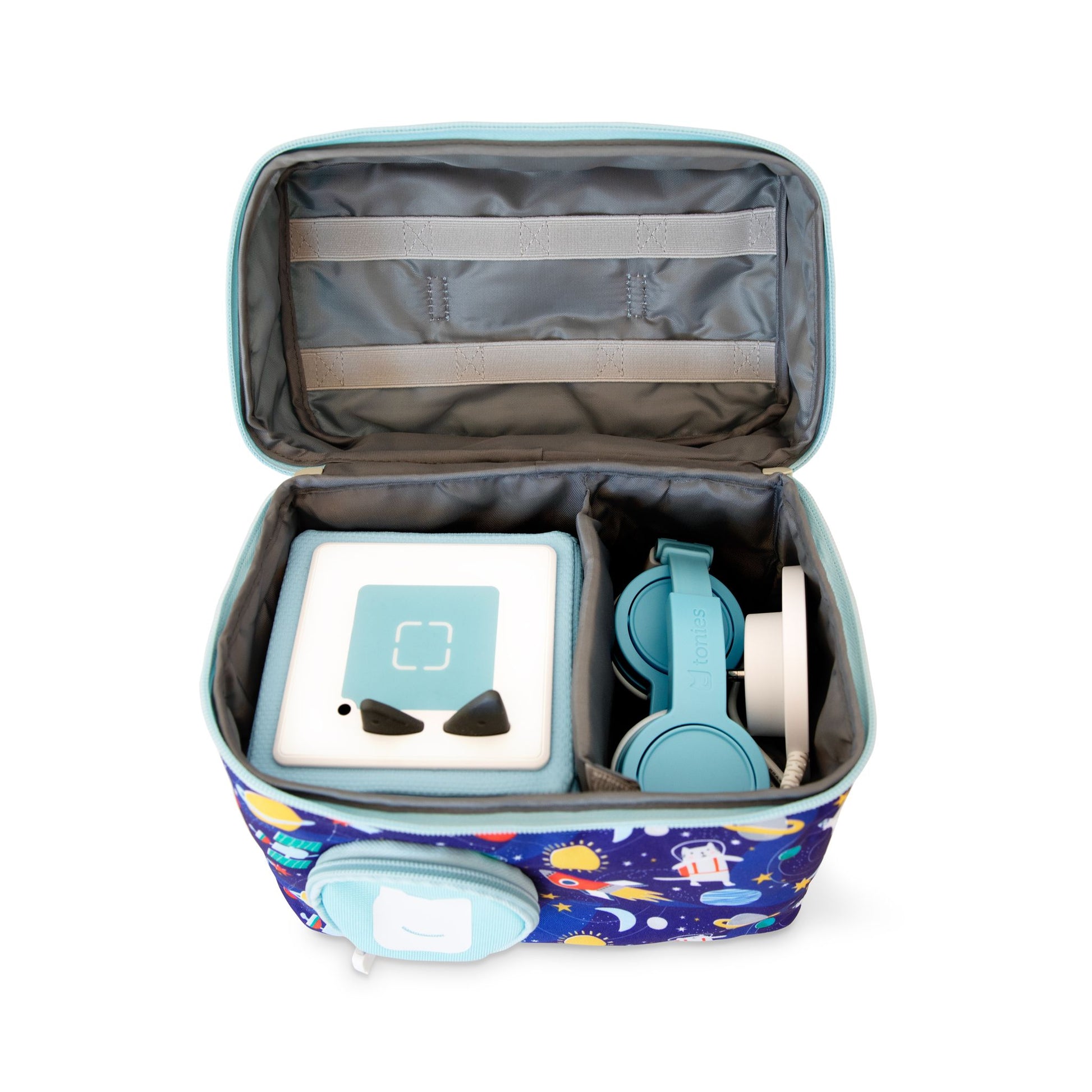 Introducing the tonies® Listen & Go Bag!Enjoy on-the-go listening with this charming carry bag designed to accommodate your Toniebox, accessories and a small collection of tonies! The Listen & Go Bag is available in 2 designs. Fly through the galaxy with the blue Stargazing bag or discover the fairy world with the pink Over the Rainbow bag! Off we go ... with your favorite stories and adventures in tow! Pack up the Listen & Go Bag with your Toniebox, 7 or more Tonies, headphones, charging station, and other treasures to easily transport everything in one place! Going on a family trip? Avoid the hassle of unpacking everything. Just open the loudspeaker flap, pop on a Tonie, and start listening! The outer fabric and lining consists of 100% recycled PET. Thanks to the robust material, the padded dividers and the inner mesh pockets, your Toniebox and Tonies are always safely stored. The bag is safe for your Tonies and your child, as it’s tested to the best standards. Highlights: - Room for the toniebox, charging station, accessories and more – take it all with you!- Pockets for 7 tonies with space for more- Zipper opening to listen to Toniebox while on the go without unpacking- Padded shoulder strap- Original tonies® Designs: Pink Over the Rainbow- Safe for your child and the box – Tested for the best- 100% recycled PET - sustainable product- Ages: 3+