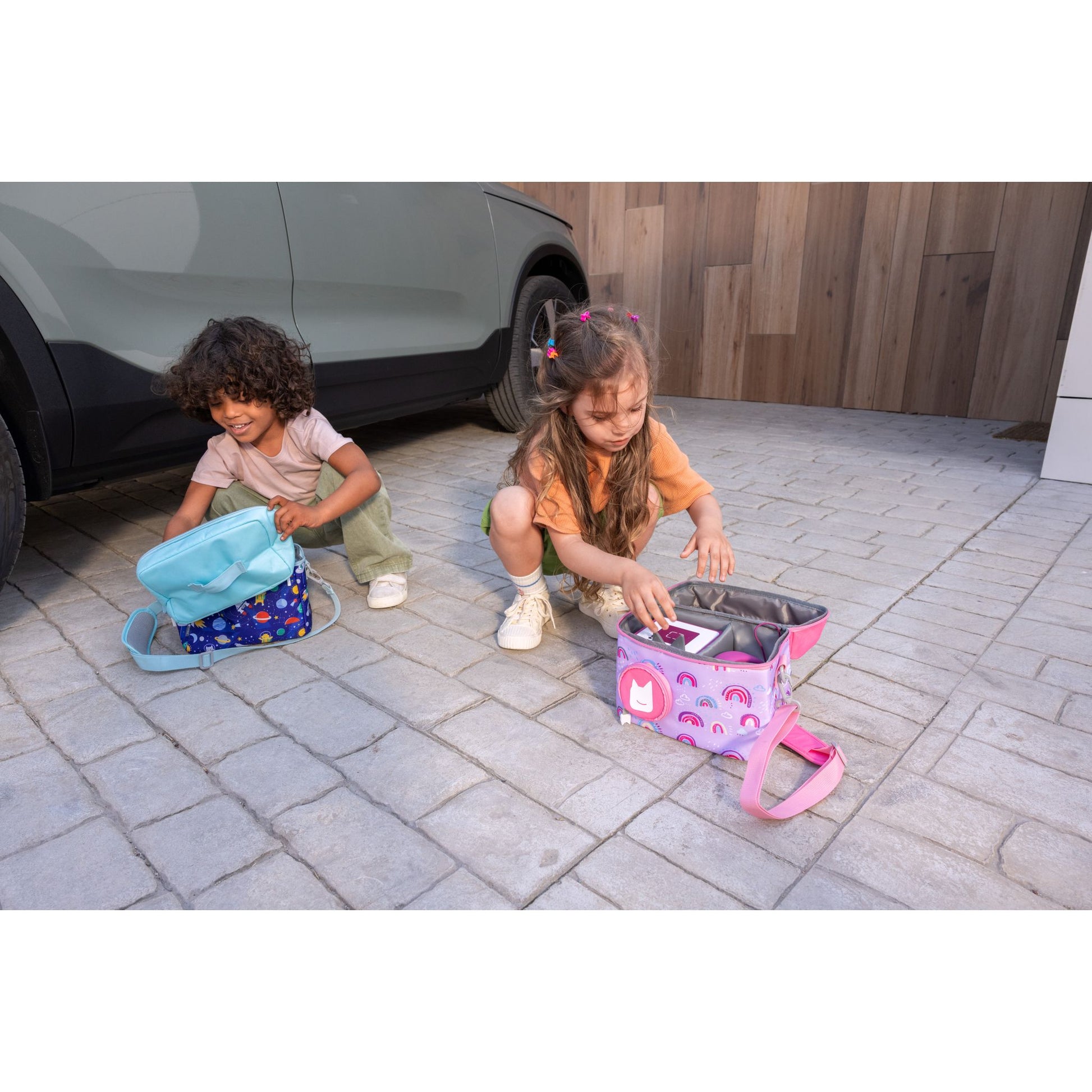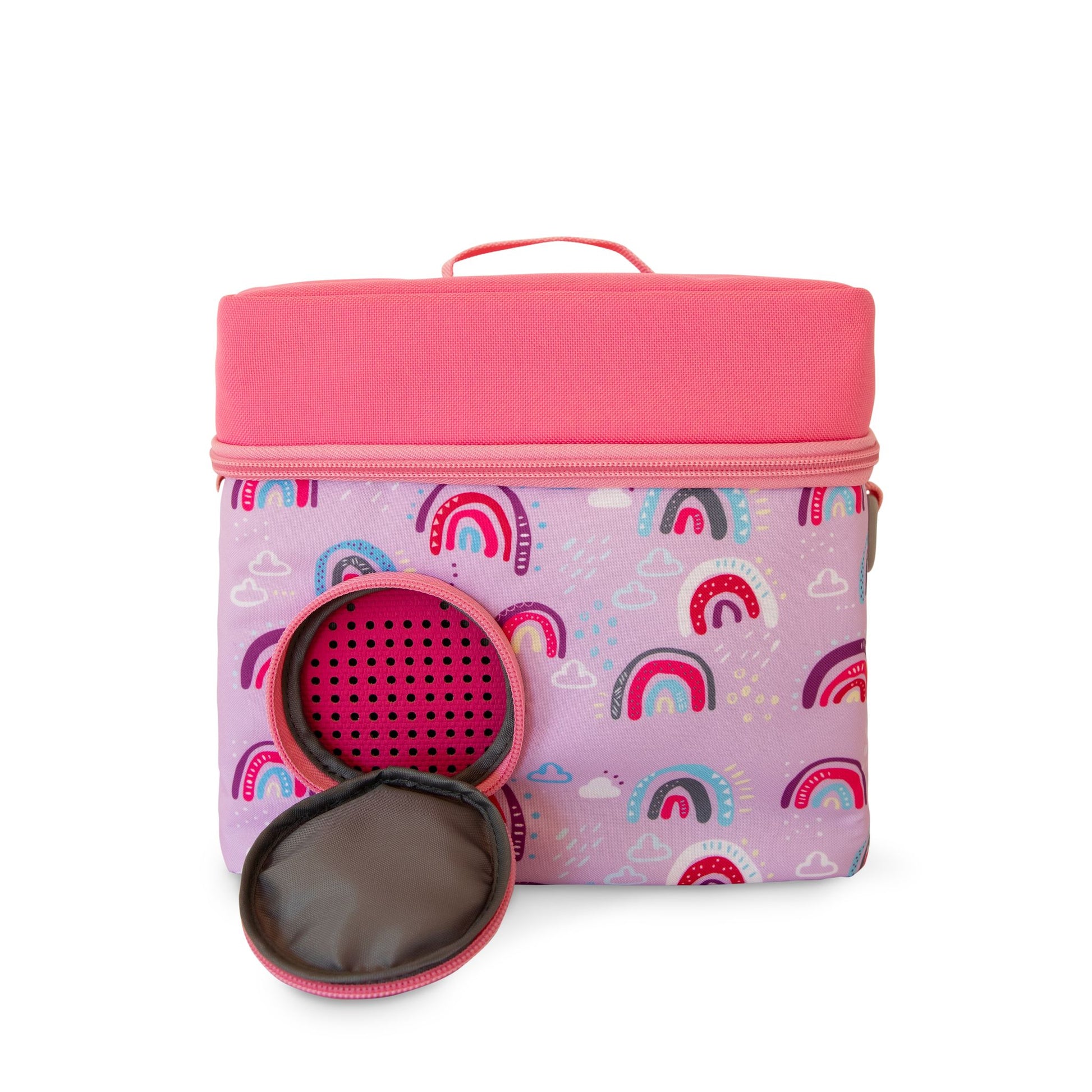 The Listen & Go Bag is available in 2 designs. Fly through the galaxy with the blue Stargazing bag or discover the fairy world with the pink Over the Rainbow bag!