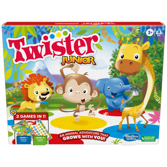 Get ready for a roaring good time with the Twister Junior game, an animal adventure that grows with your little movers! This fun game for kids ages 3 and up includes a 2-sided mat and reversible spinner for 2 levels of play. With the Level 1 Animal Safari side of the mat, kids spin to move along the safari trail. As they take turns, each child has an opportunity to discover colors and reenact animal sounds and movements. Flip the mat over to level up to the Level 2 Animal Party game. Spin the spinner to see what color and animal players must place their foot or hand. The last player standing, wins! For 2-4 players, this Twister Junior game is fun for the whole family and just right for indoor active play.