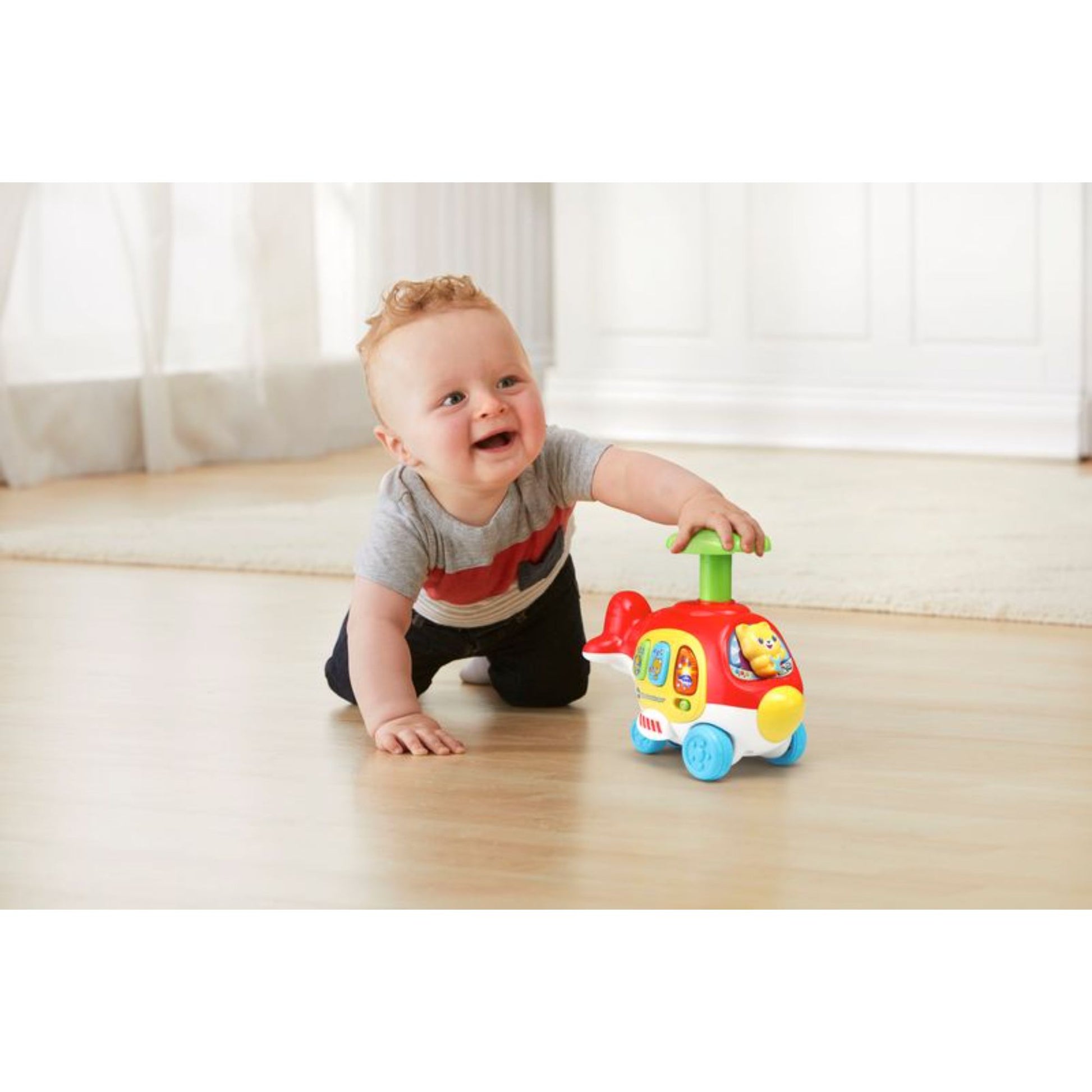Fasten your seat belt. We're ready for an adventure! Take off into learning with the Push and Spin Helicopter by VTech! Press the top rotor blade to see the helicopter roll forward, which will support your baby in discovering cause and effect relationships. The 2 animal buttons are great for exploring as they trigger lights, catchy music and fun responses.