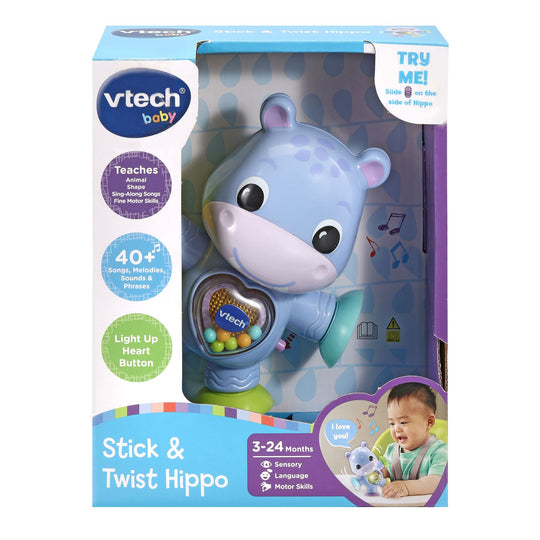 Introducing the adorable Stick & Twist Hippo by VTech! Attach the hippo to a smooth surface, such as a table top or high chair using one of the hippo’s 4 suction cups on its arms and legs. Littles one can shake the Stick & Twist Hippo to trigger responses and to see and hear the beads in hippo's light up heart button rattle around.